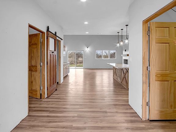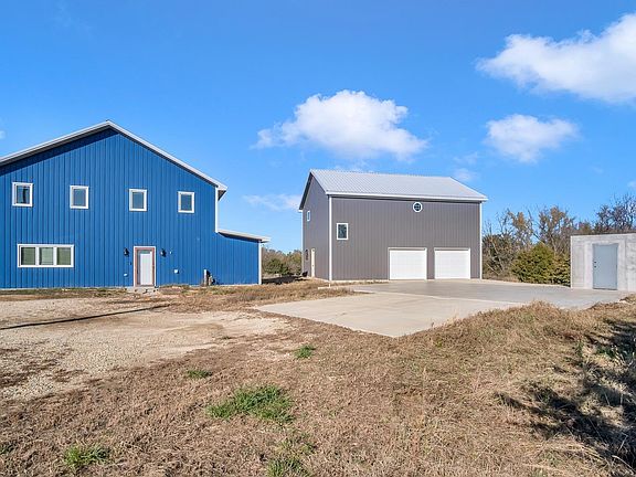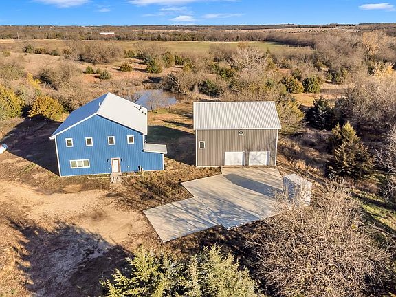 Welcome Home to your remote retreat in Newton Kansas! Bring your pioneering spirit and come discover the possibilities this property offers. Situated on 38 Acres, and Just minutes from Newton and Waltons Landing, This Modern Farmhouse Barn-dominium, built by by Yoder Engineered Structures is clad in 26 gauge panel steel in color Gallery Blue, a fitting choice for showcasing this work of art! Inside you will be delighted to find a spacious 2640 sq ft of modern country living, heated and cooled by 2 LG Heat Pump Mini-Split units, with the main floor offering the primary suite with shower, double sinks, toilet room, and walk-in closet, a well appointed kitchen featuring a suite of matching stainless steel appliances, pantry space, and large island, This open layout design connects to the Grand 2 Story Vaulted Living/Entertaining area complete with views of the property and pond out the patio doors, The Living Room features a Full Height Fireplace with tv mount and tile accent, housing the wood burning stove. Entertain for the Holidays in Grand Hotel Style, as this space's height can perfectly showcase a tree in excess of 12 ft. Natural light is plentiful as-is with the large existing windows, but enclosed within the wall above the patio doors is framing for large picture window if you desire to add even more. The main floor includes additional storage areas, an office nook, and main floor laundry hookups in a separate room with access to the Above Ground Concrete Storm Shelter. Upstairs you will appreciate a continuation of thoughtful layout with the Large Loft Living Area, mirror image Large guest bedrooms, a second full bath with double sinks and tub/shower combo and a high tech utility room housing the Tankless Rinnai Propane Water Heater, with recirculating pump for the Radiant Floor Heat System. This home is currently livable, but waiting for your finishing touches regarding completion of interior construction, including but not limited to...remainder of flooring install, trim carpentry and finishing throughout, drywall finishing and paint throughout, and some areas of drywall install remaining. A 2story Garage also built by Yoder is located next to the home. With double Garage doors in the front, and a View Out Tandem Door in the back, this Garage offers a well lit during the day and functional layout on the main floor for all of your parking and equipment storage needs. Upstairs you will be awed by the beautiful framing with three sets of French Doors designed to open out to a future deck you could build, and features Vaulted Ceilings. This space is unfinished but welcoming as a quiet retreat with grand views for wildlife watching across the expanse of the property and offering space for your hobbies. Utilities are run to this building, but not installed yet. The property also includes two more out-buildings, a tool shed and chicken coop with run, and a separate fenced garden area. Strolling through the property is a mini vacation, as you will be delighted to explore a variety of terrains, and Native Kansas Flora and Fauna. From Prairie Grasslands, to Wooded Sanctuaries rife with Deer Tracks and Bedding Areas, on to the 16.93 acres of tillable dry land farmland situated at the North end of the boundary, this property offers it all! Look for the Land category listing for this property as well for additional pictures of the land and outbuildings.
