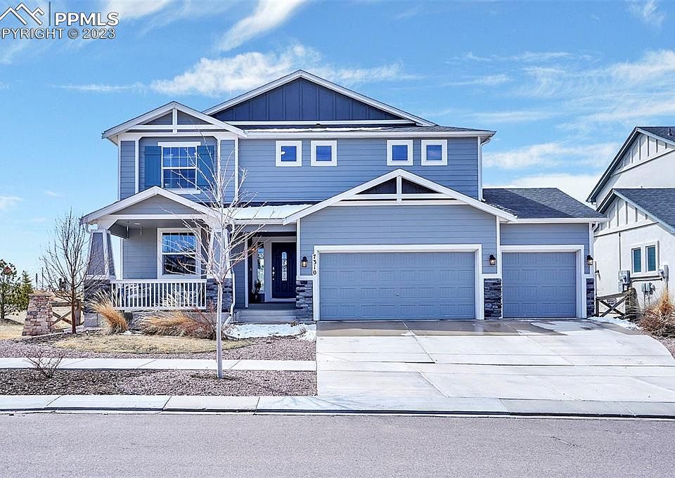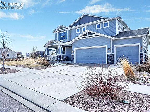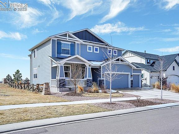 This beautiful and popular Monarch floor plan by Classic Homes features 4 large bedrooms, 3 baths, a private main level study, spacious upstairs loft, a formal dining room, an oversized laundry, 3 car garage, and a full unfinished basement for future expansion! Situated on a large, premium corner lot in the highly desirable Banning Lewis Ranch community, this home has fantastic curb appeal with a welcoming covered front porch and fantastic views of Pikes Peak from the rear yard and covered rear patio! Decorator colors and incredible natural light throughout. Huge kitchen with white cabinets, stainless steel appliances including a gas range, quartz countertops, an expansive breakfast bar, walk-in pantry, farm sink, and mud room area leading to the garage. Adjoining the kitchen is a sunny breakfast nook and a family room centered around a cozy gas fireplace. The whole main level has an open living concept with extended laminate hardwood floors, upgraded designer light fixtures and decorative arches around the separate formal dining room. Upstairs, you'll find a central loft area with mountain views (perfect for reading and relaxing!), the private master suite, 3 additional bedrooms, a full bath and an oversized laundry. A rare floorplan with all 4 bedrooms on one level, and all the rooms are sizable and spacious! The owners suite has tons of windows, a spa bathroom with dual vanities, a soaking tub and tiled shower, and a huge walk-in closet. The unfinished basement adds an extra 1400 sq ft of future potential - complete with rough-ins for a bathroom and a wet bar. This home is fully landscaped and fenced, and has an automatic sprinkler system. Central AC. Close to all the amenities that Banning Lewis Ranch offers including award wining schools, the community and fitness center, water park, playgrounds/parks, outdoor pool, dog park, as well as walking paths/trails. Easy access to Powers corridor, shopping, restaurants, Peterson AFB, etc.
