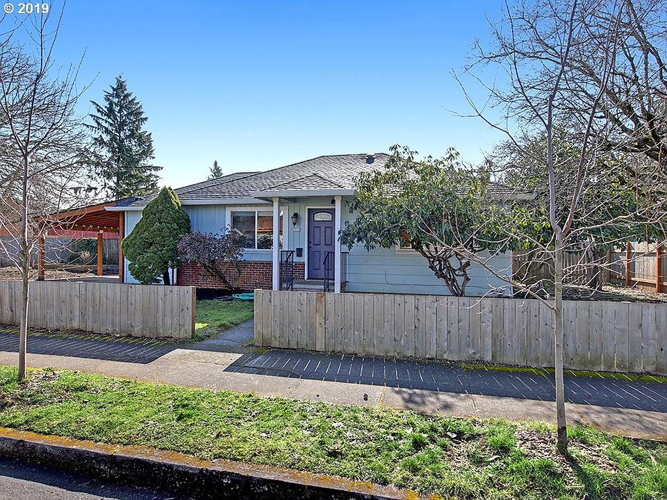 Fantastic mid century set on a bright corner lot in Foster Powell. Blocks from Portland Mercado, food carts, cafes & Mt Scott Community Center. 3 bedrooms, 2 remodeled baths all on the main. Updates include master suite, vinyl windows, gas furnace, roof & electrical. Renovated kitchen w/eating bar, slab counters, ample storage, stainless appliances. Unfinished basement with great ceiling height. Sunny yard w/gardening options galore. [Home Energy Score = 3. HES Report at https://rpt.greenbuildingregistry.com/hes/OR10054292]
