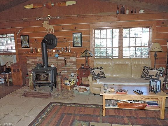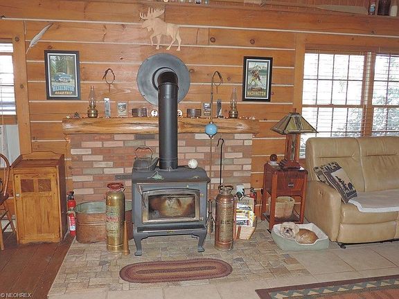 Peaceful country setting beautifully landscaped with trees and perennial gardens. This log home has 2 finished floors with a walkout lower level. There are 2 woodburning stoves for heating both levels There is also a propane (tank owned by seller and will stay) gas furnace. However, sellers choose to heat with wood. The first floor has wood and ceramic flooring, newer Schrock kitchen cabinets with stainless appliances. Attic has extra blown-in insulation. There is a 15X30 covered deck/porch to watch the sun set, great for entertaining, fenced brick patio off of the kitchen. 10X12 shed, 10X14 insulated shed with a dog run and an 8X10 shed attached to the garage for a tractor. This property is meticulously maintained showing pride of ownership. Gas and oil rights convey. Come see for yourself! You won't want to leave this place once you visit. Excluded items are as follows: kitchen island wagon wheel, workbench, water fountain, tool peg board and sink in garage.