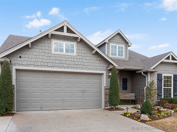 Welcome Home! Immaculate single level home with curb appeal featuring 3 bedrooms, 2 full baths, 2 car garage, and open living area. Extra deep pantry with extensive shelving space. Primary suite features a master bath with an upgraded luxury shower, dual sinks, and extra cabinet storage. Extended back patio has space for grilling, entertaining, and enjoying the professionally landscaped yard space. Neighborhood features miles of sidewalks, a playground, and TWO POOLS. Prime location near the Creek Turnpike with grocery stores, schools, restaurants, and more!