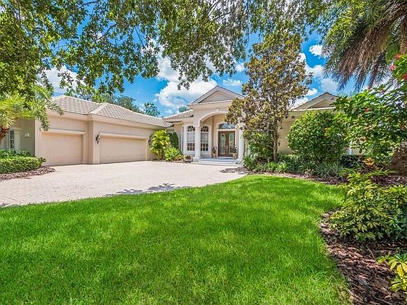 THIS HOME IS SITUATED IN THE CUSTOM HOME NEIGHBORHOOD OF HYDE PARK. THE VERY SPECIAL ENTRANCE TO THIS STREET IS UNIQUE TO UNIVERSITY PARK COUNTRY CLUB AND IS ACCENTED BY A BEAUTIFUL ELEVATED ROTUNDA, LIGHTED AT NIGHT, IT IS SPECTACULAR! ALL THE HYDE PARK CUSTOM HOMES ARE SITUATED ON THE WATER, WITH MANY OF THE HOMES VALUED OVER 1 MILLION DOLLARS. THIS STUNNING HOME HAS A BEAUTFUL FRONT ELEVATION, IS ON ALMOST 1/2 ACRE, AND HAS 128' ON THE WATER! WONDERFUL COLUMNS AND CUSTOM LEADED GLASS DOORS WELCOME YOU TO THIS EXQUISITE HOME. OTHER WONDERFUL FEATURES INCLUDE HIGH CEILINGS, CROWN MOLDINGS, TRAY CEILING ACCENTS, BEAUTIFUL BUILT-INS, FORMAL DINING ROOM WITH BAY WINDOW AND ARCHED INSET FOR A BUFFET. DESIGNER FIREPLACE ACCENTS THE LIVING ROOM, OPEN CHIEF'S KITCHEN WITH STONE COUNTERTOPS, CUSTOM CABINETS WITH RAISED PANELS, BREAKFAST BAR AND GOOD MORNING NICHE, GAS COOKTOP, WALK IN PANTRY! 3 SPACIOUS BEDROOMS (GUEST BDRM. EN SUITE), PLUS DEN AND 2ND OFFICE/DEN/GAME ROOM. THE OWNER'S RETREAT IS SPECIAL WITH A SITTING AREA, LARGE CLOSETS, CUSTOM BATHROOM WITH MARBLE JACUZZI TUB AND HIS AND HER SHOWERS. LARGE LANAI , POOL/SPA, COVERED OUTDOOR LIVING! NEW A/C IN 2017, CENTRAL VAC, BRICK PAVERS LEAD TO A VERY LARGE 3 AND 1/2 CAR GARAGE! LOTS OF STORAGE!