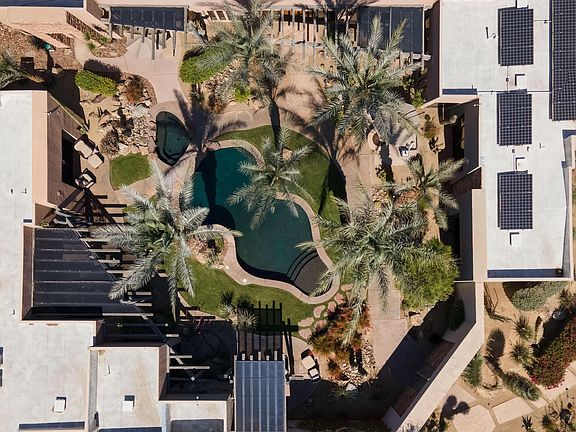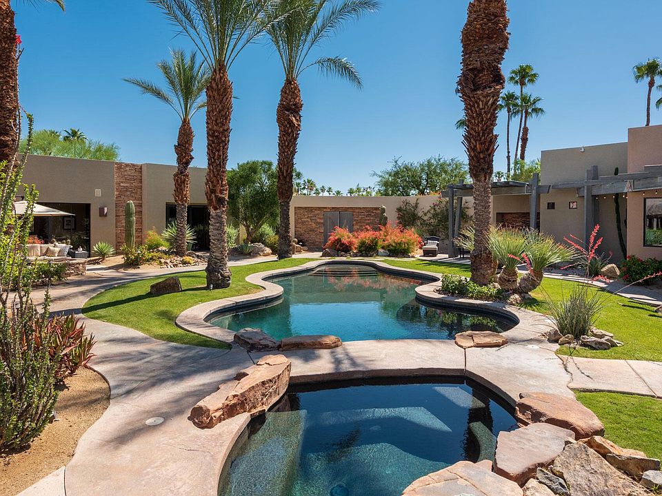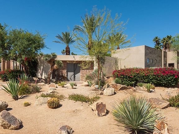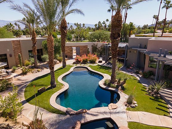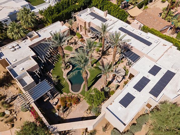 Welcome to this ultra modern, PRIVATE 1/2 acre Desert Estate within walking distance to the El Paseo shopping and dining district. You will say WOW when you see it. This walled compound has 5+ bedrooms and 4.5 baths which are broken down as follows: The main house has high ceilings with 3 bedrooms, 2.5 baths, kitchen which is open to the great room and a large guest house that has two bedrooms, a large family room and den and kitchen with eating area all with access to the relaxing pool, spa, fire pit, and custom landscaped desert gardens. The floor to ceiling windows and sliders gives the illusion of the ''outside being in.'' The outdoor barbecue area, and several covered patios complete this Tranquil Oasis. Three fireplaces and an OWNED Solar system, plus super large 3 car garage with storage, LED lighting, and more. Sold Furnished per inventory list. Most items included. NO HOA DUES.