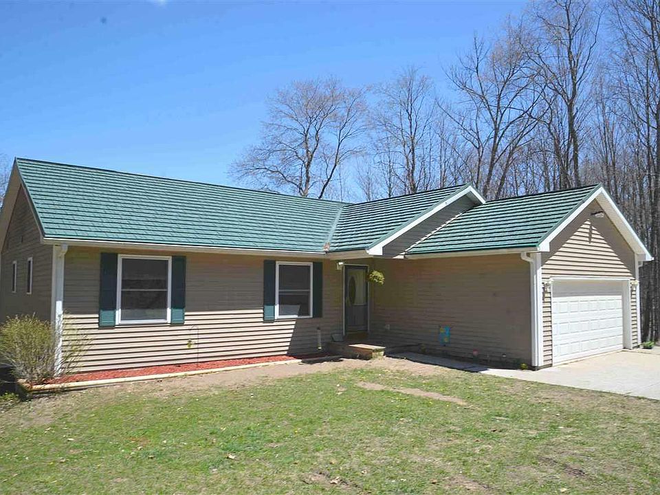 QUALITY BUILT 3 bedroom, 3 1/2 bath home beautifully situated on 5 partially wooded acres. Amenities include modern white kitchen cabinetry, bar seating, pantry and stainless refrigerator; main floor bedrooms; laundry room; attached garage and more. The walkout lower level is enhanced by a large family room plus an unfinished portion for a shop or storage. You will appreciate the ultra low maintenance features including vinyl siding and a metal roof. There is an additional 26' x 32' detached garage perfect for extra storage or a workshop Try your hand at gardening in the garden area. Excellent location close to recreational trails.