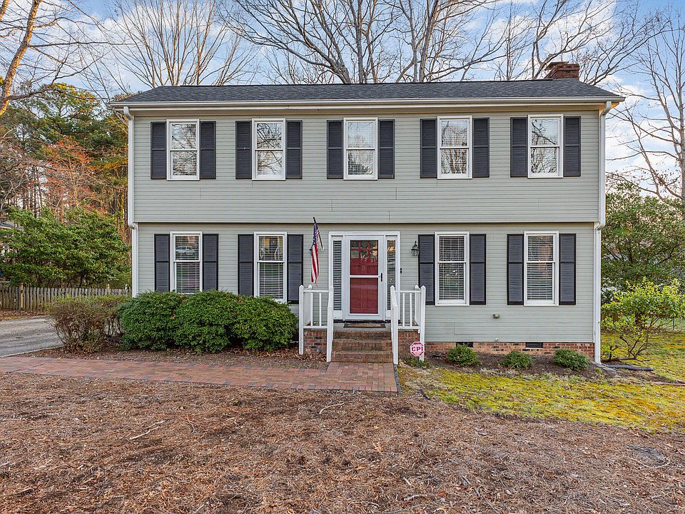 Welcome to this charming two-story home nestled in a prime North Raleigh location! Inside, hardwood floors adorn the living spaces, complemented by an abundance of natural light that fills the rooms. The living room features a cozy wood-burning fireplace and seamlessly flows into the dining area, complete with built-ins and updated light fixtures, ideal for hosting gatherings! The kitchen boasts granite countertops, stainless steel appliances, ample cabinet space, and a spacious pantry, catering to both functionality and style. The main level hosts the generous primary bedroom, complete with an ensuite bathroom with a walk-in shower for added convenience. Upstairs, two additional bedrooms await, providing versatility for guests or a dedicated home office, while a large attic space offers ample storage solutions. Outside, a spacious back deck overlooks the wooded lot, offering a tranquil retreat with a firepit and garden beds, perfect for enjoying the warmer months. Conveniently located near I540 and I440, residents enjoy easy access to shops, restaurants, and recreational activities, making this home an ideal retreat for modern living!