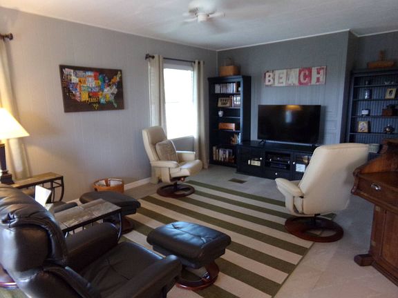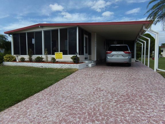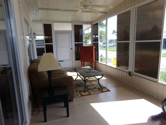This is a lovely, renovated 1979 Fleetwood double wide featuring an eat-in galley kitchen with canned led lighting, newly painted cabinets, new hardware, new formica counter tops, a counter cook top, new sink, faucet, garbage disposal, refrigerator and microwave. The formal dining area has a built-in china cabinet. A large living area can easily accommodate a sofa, several chairs and tables. A pair of sliding glass doors lead into an enclosed sun room which looks over the neighborhood and has a view of the lake across the street. The sun room also has new ceramic tile flooring and sconce lights, both installed in 2017. Also in 2017 new sub floors were added and covered with new tile flooring in the kitchen, dining and living areas. Newer laminate flooring is in both bedrooms. A full wall closet is in the guest bedroom and a new vanity counter and sink were added in the guest bathroom. An en-suite, walk-in closet and new vanity counter and sink and toilet are all features of the master bedroom. In 2015 a new central A/C unit was installed. In 2017 a new hot water tank, new floor registers, new entry and room doors, new humidistate and new window blinds were also installed. A screened lanai has new ceramic tile flooring as well as a storage shed that houses the washer/dryer, rinse tub and a work bench. Freshly painted walls and new lighting fixtures round out this lovely home. This is a move-in ready home with no work required. Located in the 55+ Community of Colony Cove. Lot rent is $818.