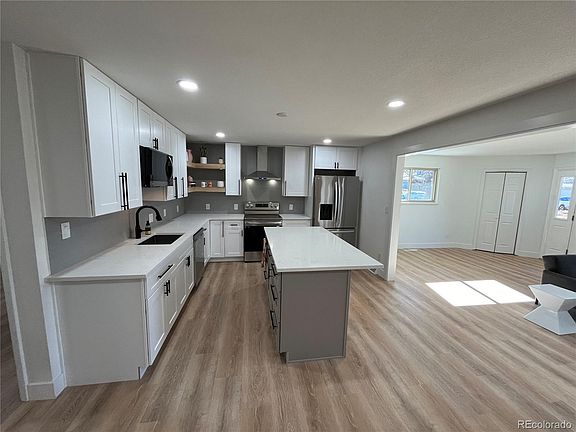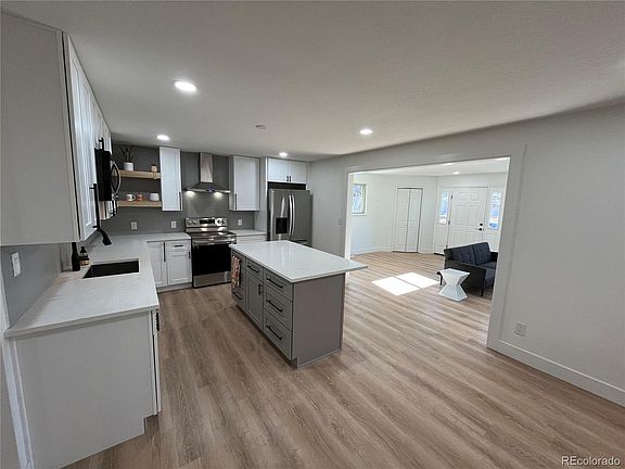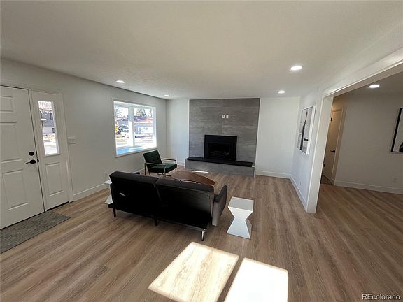 Step into main floor living in this fully renovated, large ranch home in Walnut Hills. Fresh white paint, new luxury vinyl flooring and plush carpet throughout set the tone for this sparkling remodel. You will love the cozy living room and gorgeous fireplace that are featured as you enter the home. The brand new, open kitchen is stunning with its large island, new stainless steel appliances and quartz countertops. Dining area overlooking the covered patio. Highly desired mud room with laundry hook ups with entrance from the garage. Primary bedroom with primary bathroom. The ample basement boasts a grand bedroom with a fireplace, large rec room, storage space and a brand new bathroom with a beautiful walk in shower. This home is a car lovers dream with an oversized two car garage and driveway. Brand new exterior paint and tile detail. The ample covered patio and well maintained yard are an entertainers dream. More storage in the shed outside. This home is a must see!!! Award winning Cherry Creek School District and quick access to highways, trails and light rail.