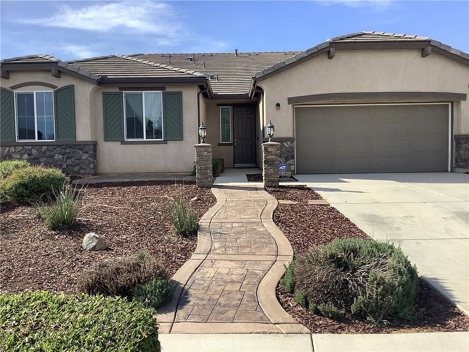 A must see, spacious Single-Story home that features, 4 bedrooms, 3 full bathrooms, and 2 family rooms. The large kitchen has wrap around cabinets, huge island, granite countertops and a walk-in pantry! This home was newly built in 2017 with an open floor plan design that showcases the formal dining room, family room with beautiful fireplace, and kitchen. The master bedroom suite is located on the opposite side of the house from the other rooms truly creating the upmost level of privacy that includes walk-in shower, deep soaking tub, dual sinks with plenty of cabinet space and a large walk-in closet for the buyers that need extra space. For those buyers who need even more space, this home contains an additional bonus room located next to the huge laundry room! This home also has sliding doors that open to a beautiful large backyard that features a fire pit, covered patio with outdoor ceiling fans with low maintenance drought friendly landscaping. Other benefits to note: No HOA, Has Solar System, fire sprinklers, ceiling fans and a tankless water heater.