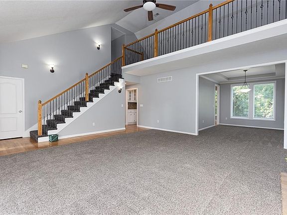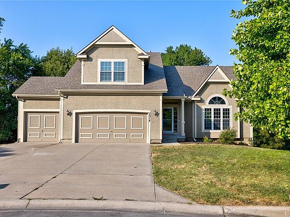 Beautiful 1.5-story with 4 bedrooms, 3 and a half bathrooms and 3 car garage in one of Shawnee's most convenient, family-friendly communities. Cozy fireplace in the huge living room with soaring cathedral ceiling. Great kitchen with built-in china-cabinet; roomy, light-filled breakfast area & half-bath around the corner. Formal dining. Main floor laundry room with access to the garage. Main floor Master bedroom with walk-in closet; master bathroom has double vanity, jetted tub & walk-in shower. Upper level with 3 spacious bedrooms with walk-in closets & 2 full baths. Large loft overlooks living room. Deck with stairs leading to treed lot on very private cul-de-sac. Walk-out basement with plenty of storage room opens onto large patio. New carpet and vinyl plank, fresh paint. Easy access to highways & shopping. De Soto school district.