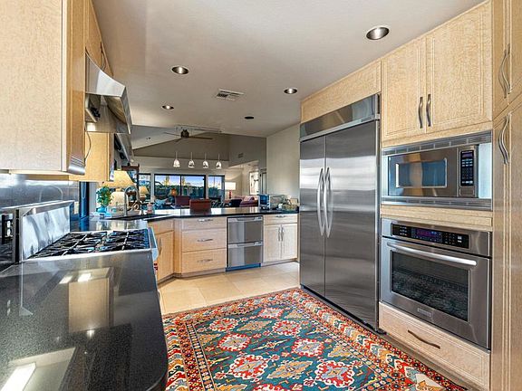 Lovely expanded 2 bedroom 2 bath + den. Kitchen has expanded eating area and desk and Primary bedroom has expanded sitting/office area. This freestanding Skyview plan is located on a corner lot with wrap around paver patios and great mountain views. The landscaped garden walls provide privacy on patio areas surrounding the property.Tile flooring, custom solar shades, knotty alder custom doors, tumbled paver walkways & patios are just some of the amenities. The floorplan has been redesigned to offer spacious living areas and cozy den/TV room. Primary suite with sitting area has large tile walk-in shower, double vanity, built-in drawers and huge walk-in closet. Kitchen has Wolf gas range, built-in fridge, custom cabinet doors and large breakfast room with built-in desk. Countertops are black Cesarstone. The double garage floor is epoxy finish. Solar panels have assumable loan @ $168/mo. Windows have V-coat tinting.