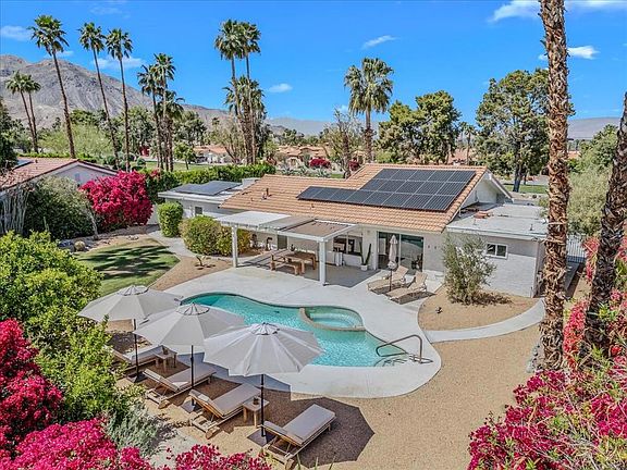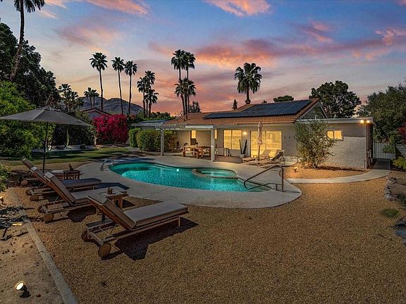 Delight in your eco-friendly, Scandinavian luxury retreat, nestled in the serene foothills of South Palm Desert only minutes above El Paseo shops & eateries. This meticulously renovated Green Home seamlessly blends modern comfort with natural charm, all while prioritizing sustainability & the property's historic character.Inside you're greeted by the warmth of polished concrete floors, a hallmark of contemporary design & energy efficiency. The interior exudes a relaxed bohemian vibe, carefully curated decor & vibrant accents. This 3-bedroom 2-bath home has been thoughtfully updated with every detail chosen with sustainability in mind & is powered by a rooftop solar panel array.Out front a spacious wrap-around patio awaits to unwind & soak in the breathtaking views of the surrounding mountains. Step into the expansive backyard & discover your own private oasis. A sparkling salt water pool & spa invites you to take a refreshing dip on warm desert days while the native landscaping creates a tranquil sanctuary, including your personal organically grown citrus trees. The desert landscape enhances the property's natural beauty while requiring minimal water & maintenance, combined with panoramic views of the surrounding mountains, a feeling at home in the desert's natural wonders.Boasting a prime location in the tranquil foothills of S. Palm Desert, enjoy easy access to hiking trails, golf & all the amenities of city living, a world away in your own private retreat