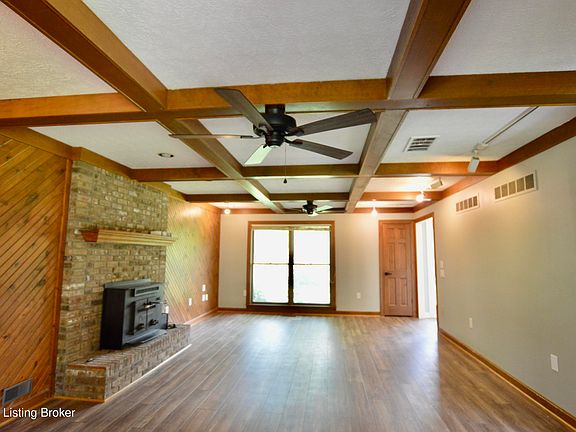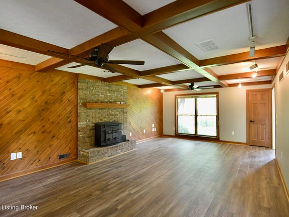 Welcome to this brick two story home with 1.78 acres located in Fern Creek with stone entry columns and split rail fence. The home has been freshly painting and new flooring throughout most of the home. The main floor consists of a large cozy rustic living room with a fireplace with a beamed ceiling, and ceiling fan. Track lighting and closet as well. The living room leads out to the partially covered two-tiered back deck where you can enjoy the land. The main level also includes a separate dining room, kitchen with a breakfast bar, plenty of cabinet, desk area and recessed lighting. Stove, dishwasher and microwave to remain. The dining area consists of a bay window, ceiling fan and pantry. Entry to the partially finished basement. Large family room with cabinets and shelving that was used as a needed first floor bedroom. You will love the full bathroom off the family room with a stand-up tiled shower and sliding barn door. The family room leads out to driveway. There is a half bath on the man floor with a sliding pocket door as well. The second floor boasts of a spacious primary bedroom with new carpet and a ceiling fan, walk in closet leading to extra storage area. Relax in the jetted tub with a tiled tub surround and double bowl vanity. Three additional nice sized bedrooms with new carpet and ceiling fans. Hallway full bathroom. Laundry room. There is also a laundry area in the family room on the first floor. Enjoy the partially finished basement with a spacious family room and an additional room that could be used as a game room or office. An unfinished workshop area. Very spacious driveway that allows for plenty of parking. There is an additional gravel driveway for RV or boat storage with an electrical outlet. Covered open stand-alone building with concrete pad for storage. There is another covered small wood structure on the property that could be used for multiple purposes. Home has city water. There is covered well on the property that is connected to the water spigot in the rear of the house for watering the yard. This home has so much to offer. The land is a mixture of treed and cleared land. Come enjoy this home nestled in a private setting. Great for entertaining. Do not turn into Adams Run subdivision as there is no access to Mayrow Dr. Please use Cedar Creek Rd. The threshold leading into the family room is being replaced this Friday. The back deck is going to be stained