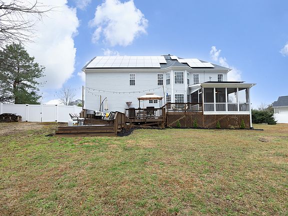 Welcome to Bloomfield, a popular Willow Springs neighborhood. Bloomfield has oversized streets and well-cared-for homes located on the Wake County side of Willow Springs. When you arrive at 7137 Pekin, you will be impressed by a home's curb appeal, large flat over a one-acre lot, privacy fenced yard, side-loading three-car garage, and outdoor space galore! Step inside to find a light, bright home with details like hardwood floors, crown modeling, and a dramatic two-story family room with a stone floor-to-ceiling fireplace surround. The upstairs Primary bedroom features a sitting area, a romantic fireplace, a vaulted ceiling in the primary bath, and views of the woods behind the home. The seller added a shed in 2019, Decking in 2019, and Solar panels in Dec 2023, which brings the electric bill to nearly zero most months of the year. The three garage has a Level II electric vehicle plug.
