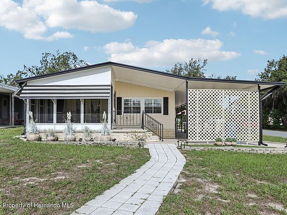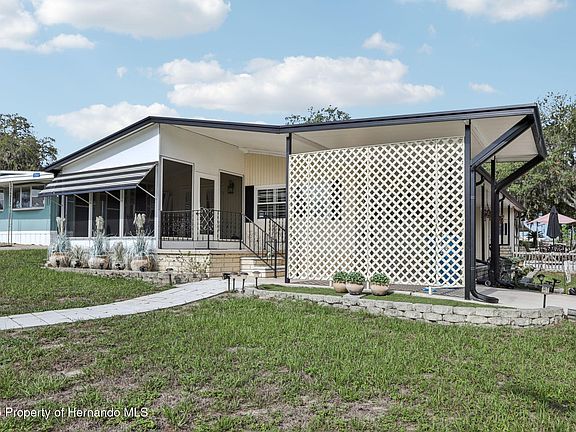 Pending- Accepting back up offers ! Welcome to High Point! If you are looking for an active and vibrant 55+ golf community with low HOA fees and want to enjoy Florida retirement living at its finest, then look no further! High Point is located in Brooksville Florida and boasts a relaxed yet social lifestyle that is close to many local amenities. This move-in ready 2-bedroom, 2-bath Palm Harbor double wide home is perfect for people looking for peace and quiet, as well as options for social functions and activities. Located on a spacious corner lot, this home offers many updates for peace of mind. Step inside through the beautifully designed glass front entry door to find newer vinyl plank flooring throughout the main living areas, bedrooms, and bathrooms. The kitchen features a new sink and fixtures, ample cabinet and counter space that flows effortlessly into the dining area and spacious living areas that are ideal for entertaining family and friends. The kitchen boasts beautiful cabinets that are in excellent condition with new drawers. Sit at the nicely sized island that includes plenty of storage, and room for barstools to sit on and enjoy meals. In the dining room, you will love the built in hutch! The primary bedroom is spacious with 2 closets, and the en-suite bathroom boasts a gorgeous vanity with double sinks. A full hall bath serves guests and the second bedroom. Walking through the oversized living room you will see the beautiful built in living room shelving and cabinets, and new plantation shutters that cover all the windows in the home. Step through the new French patio doors and enjoy the screened lanai patio with optional vinyl panels, perfect for relaxing and socializing year-round. From the patio you can take a stroll to the mailbox on the paved walk way. For added protection from the elements this home features a covered carport, and attached to the home is a locked and covered storage room. Updates that provide peace of mind include new AC (March 2025), new gutters (2024), upgraded vinyl double-pane windows through out, two new Kohler toilets, and a metal roof. High Point offers spectacular amenities such as an 18-hole golf course, tennis, community pool, bocce ball, shuffleboard, and horseshoe courts, a clubhouse with a full range of activities and social events, a dog park, and there are RV storage lots available for rent. The seller is highly motivated, and all furnishings are available for sale, or negotiable. Call today to schedule your private showing!