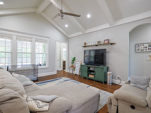 Dreaming of your own private backyard oasis? This is it! Rarely does a home in Creekside West come available with an in-ground saltwater pool—and this one truly delivers. The backyard is a showpiece, featuring a sparkling pool, privacy fence, covered pavilion, and peaceful views that back up to a wooded area. Whether you're hosting friends or just relaxing at the end of the day, this outdoor space is hard to beat. Inside, the home offers 4 bedrooms, 3 baths, and an inviting open layout with prefinished hardwood floors, a bright great room, and a wall of windows that draw your eyes right to that backyard retreat. The kitchen features white cabinetry, granite countertops, stainless steel appliances, and a large island with a farmhouse sink—perfect for gatherings. The master suite is a spacious escape with double vanities, jetted tub, tiled walk-in shower with dual heads, and a custom walk-in closet. The 4th bedroom is ideal for guests or teens with its own bath access, and the third garage bay makes a perfect man cave or golf cart space. Plus, you'll enjoy access to the community pool and playground, and you're less than 2 miles from shops and restaurants. What really sets this home apart, though, is that private pool—a rare find in this sought-after neighborhood. This one won't last long!