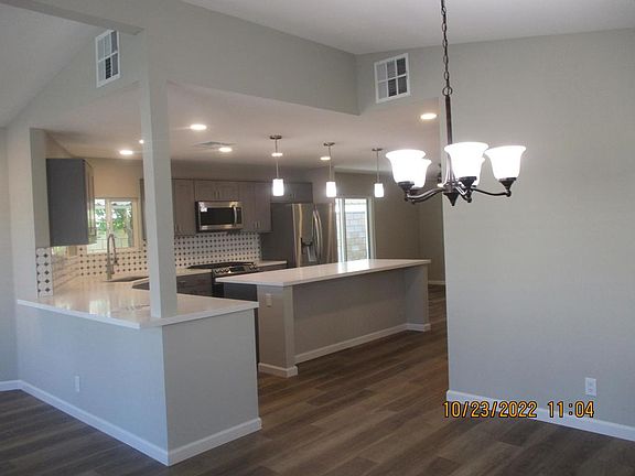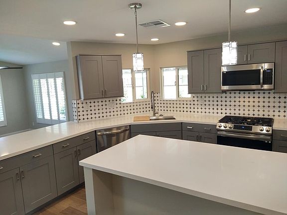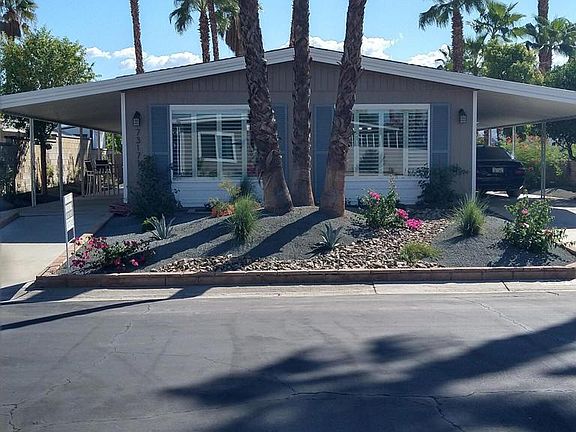 Totally remodeled. Light and bright home, beautiful finishes with a 433 cert. Nothing has been left undone. When you arrive you can't help admiring the new landscaping with drought tolerant plants and a new drip irrigation system. The soaring palm trees are impressive. This is a roomy and spacious 2 bedroom, 2 bath home with family room on fee land. Enter into the bright living room with cathedral ceiling, quality plantation shutters, ceiling fans with LED lighting and remotes and beautiful plank laminate flooring throughout. The living and dining area is open concept with the kitchen and family room area. This kitchen is top of the line with new dark grey soft close cabinetry, crisp white quartz countertops and it has an over 8 foot island for that serious cook to work from. There are two island over hang seating areas so your friends and family can kept the cook company. Included are new stainless appliances such as an LG french door refrigerator, a self cleaning/convection slidein range and a 3 rack lighted ultra quiet dishwasher and marble backsplash. The master bedroom has patio access, recessed lighting and is attached to a beautiful full bath. Custom tiled shower, luxurious freestanding tub and dual sinks. There is a guest bedroom and bath with free standing custom tiled shower. This home has all new plumbing, electrical, drywall, dual pane windows and recessed lighting throughout. Large lot. An extra 10 feet of space behind the backyard wall if the owner wants to use.