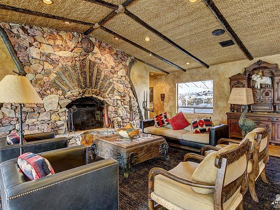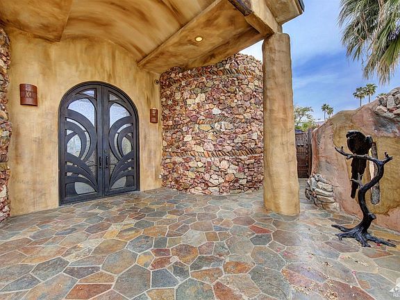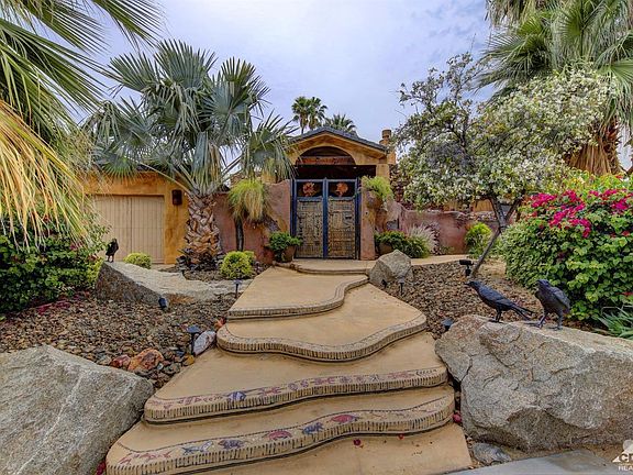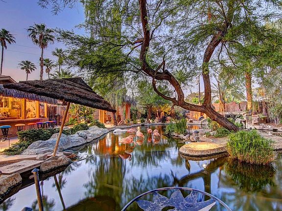 Splendid Estate on an acre in the heart of So Palm Desert, walking distance to El Paseo. Reconstructed in 2007. Completely walled for privacy. As you enter the front doors of this very unique property you will sense the feeling of serenity and love for everything living. The home has an open floor plan with contiguous kitchen, dining room, bar area and family room plus a wall of glass sliders that disappear into the wall to open the inside to the most picturesque garden area with water falls, lagoons with flamingos,a pebbled pool, adorned with a brass Rhino and life sized lion perched on a rock watching the crocodile approaching the lagoon Outside covered full bar & TV area and one hole golf with a bunker, all bordered by selected plants. The main house has two bedrooms, office, and lg laundry room. Stone flooring. A casita with full kitchen, bedroom and 1.5 bathrooms. Loggia with full bar fireplace and TV area. Buyer to verify sq footage.