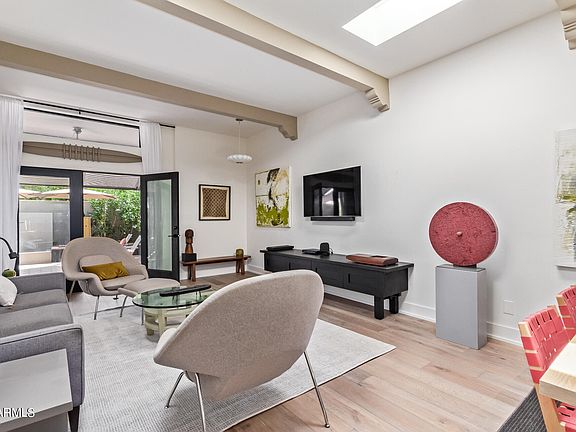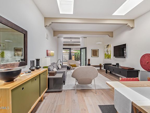 Located near Old Town and downtown Scottsdale, this 2-bedroom + den townhome offers a stylish transformation. A custom glass-and-steel gate leads to an elegant interior with 7'' white oak floors, 10-ft ceilings, beams, skylights, and French doors opening to a private courtyard with a custom fountain. The updated kitchen features dark gray and white cabinets, Silestone countertops, stainless steel appliances, and a Waterworks backsplash. The primary suite includes a luxurious bath with a 6-ft tub, separate shower, and double vanity. The den can be a third bedroom. In-Unit Laundry w/ new washer/dryer.New windows, doors, and thoughtful upgrades throughout. Minutes from Scottsdale's dining, shopping, golf, hiking, and entertainment. A 15-minute drive to the airport. Move-in ready!