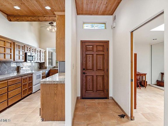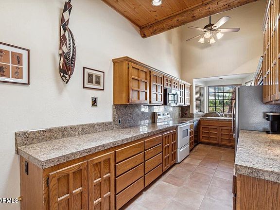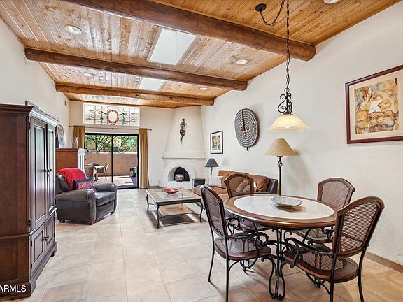 This easy-to-maintain, single-level townhome is nestled in the Villa Palo Verde community, just minutes from the vibrant heart of Old Town Scottsdale. Offering 2 bedrooms, 2 bathrooms, a den, and a 2-car garage, this home is perfect for year-round living, a second home retreat, or an investment property (with min. 3-month rental). Step through the private, gated courtyard into the great room, where wood plank ceilings and skylights create a light atmosphere. The home features tile flooring throughout, a cozy wood-burning fireplace, and granite tile counters in the kitchen. Recent updates include a new HVAC system (2021), water heater (2022), and freshly recoated flat roof (2023). Relax on the large patio or take a short stroll across the street to the community pool.
