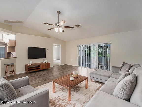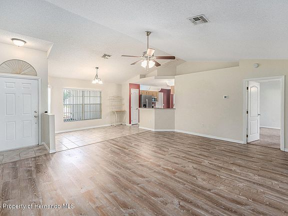 Welcome to this well-maintained 4-bedroom, 2-bathroom home in the desirable Spring Hill community! Boasting a 2021 A/C system and a fully owned water softener, this home offers comfort throughout. Step inside to a bright and open split floor plan with vaulted ceilings in the main living area, creating a spacious and inviting atmosphere. The living room and dining room combo is perfect for entertaining, while the adjacent kitchen features stainless steel appliances, abundant countertop space, and plenty of cabinetry to meet all your storage needs. A cozy breakfast nook just off the kitchen provides the perfect spot for casual meals. The primary bedroom is a peaceful retreat, complete with a ceiling fan, sliding doors to the backyard, a private en-suite bathroom, and a walk-in closet. The additional bedrooms are nicely sized, each with ceiling fans, and share a full hall bathroom. Enjoy the best of Florida living on the screened-in porch, ideal for relaxing, grilling, or dining outdoors. The fenced-in backyard offers privacy and space to garden or let pets play, and there's even a shed for storing lawn tools and outdoor equipment. Located just 15 minutes from Hernando Beach and close to County Line Road, this home provides easy access to local amenities, shopping, dining, and coastal adventures. Don't miss this fantastic opportunity—schedule your private showing today!