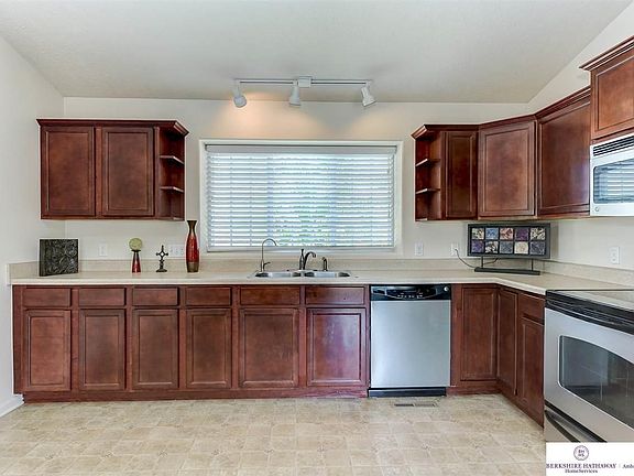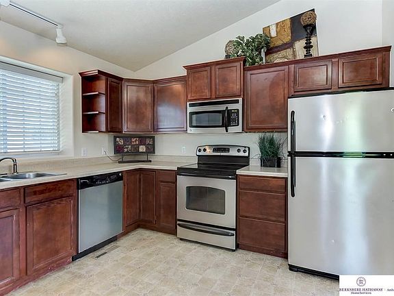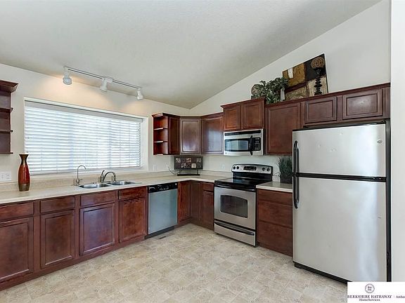 Expect to be impressed! This home boasts an open floor plan including large living room with fireplace, spacious kitchen with dark cupboards and stainless appliances, new carpet throughout, finished walkout basement, extra deep garage and more. All appliances stay. You will appreciate the view, backing to trees. In addition, there is an SID-owned lot to the north, for additional privacy and space. Convenient location near 72nd and I-680. Square footage approximate.