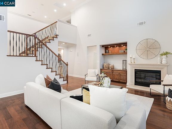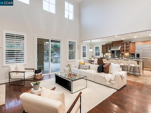 This stunning West-facing home is in the Windermere community. This desirable floor plan is complete with a main level primary retreat that features two walk-in closets, separate sinks, a seated vanity, a soaking tub, separate shower and ample cabinet space. There is a formal dining area & family room/kitchenw/ soaring ceilings, custom built-in & abundance of windows w/ natural light. Well-equipped kitchen, complete with an oversized center island, bar seating, dining nook, granite countertops, stainless steel appliances and walk-in pantry. The kitchen flows seamlessly into the family room, where you can cozy up by the fireplace. The downstairs has a large office w/ double glass doors and an en suite guest room. The upper level highlights 3 sizable secondary bedrooms, one of which is an ensuite and the other is Jack-n-Jill. There is also a loft for even more space to enjoy. Backyard has travertine tiles, low-maintenance landscaping, fruit trees, a patio & lawn area that's perfect for outdoor activities. The large outdoor kitchen is ready for all your entertaining dreams. Home has solar panels, owned. Located close to parks, open space, trails, top-rated public schools. Additionally, it offers easy access to 580, 680, shopping, and downtown San Ramon City Center.