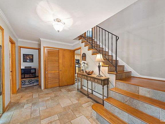 Peace and tranquility abound on this beautiful 1.67 acre wooded estate! This custom home sits back off the road surrounded by mature trees and tons of natural wildlife yet close to town, shopping and quick I-90 access! Enter to the spacious foyer with tile flooring! Large warm and inviting cozy living room with solid brick fireplace, picture window, crown molding and double French doors that lead into the awesome 3 season porch perfect for summer nights! Bright eat-in kitchen with 42" custom cabinetry, crown molding, tile backsplash, large breakfast bar island and separate eating area! Separate dining room with crown molding, fluted trim and tin accent ceiling! Convenient 1st floor bedroom/den! Huge master suite with separate sitting area with sliding glass doors to the custom deck with pergola! Private master bath with dual sink vanity and glass shower! Gracious size secondary bedrooms! Huge finished basement with so many options! Brick fireplace, rec room, play area and exercise room! Ready to go! Large shed! 30' above ground pool with private deck! Newer boiler! Tankless water heater! Neutral and great condition throughout! This home stands out among the rest! Need to get away but not have to drive? This is your house!