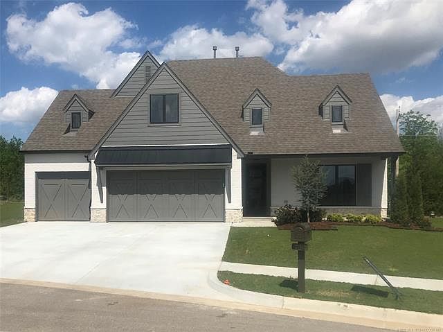 The Cruz plan on a cul-de-sac, greenbelt lot! Open concept plan with master suite open to laundry, drop zone, second bedroom with ensuite and powder bath on the main floor; two bedrooms, a gameroom and full bathroom upstairs. Walk-out attic storage. Large, covered back porch with greenbelt views. Vaulted, beamed ceilings, stone fireplace and designer finishes. Zoned for the new Bixby West campus!