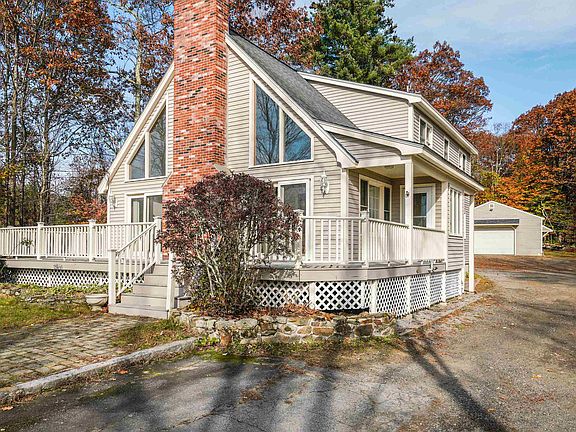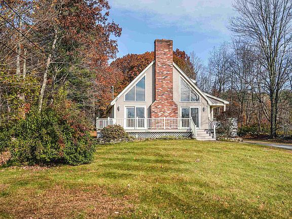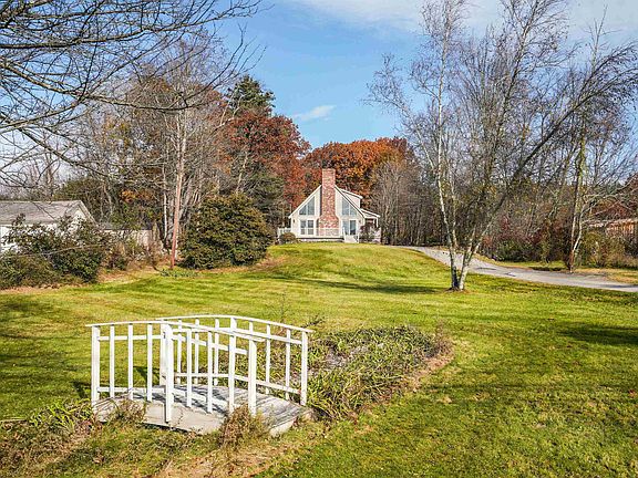 Easy to Love this Chalet Style Contemporary Cape! Set back nicely with South facing Oversized DECK and 2 PATIO doors that fill this home with lots of Natural Light. Cathedral ceiling in Living room with an Impressive STONE FIREPLACE just one of 3 flues. First floor has hall Laundry and two spacious 1st FLOOR Bedrooms and Full bath. 2nd floor Loft and spacious Primary BEDROOM with private Full BATH. Lower level is partially finished with separate office/den, workbench area (great for all your crafts), woodstove hook up and plenty of storage. The detached GARAGE is Insulated boasting an 11' ceiling height with a 16' x 9' door, subpanel of 100amps & 220 plug. 2nd floor of garage has a furnace that has the potential to heat the garage. Take a nice walk along the stonewall lined trail and Enjoy the back Woodlot with small STREAM & Stonewall Boundries! Appealing, sensible home in very GOOD condition is well worth the Visit. OPEN HOUSES Sat. Nov.11th 12pm-2pm & Sun.Nov.12th 10am-12pm.