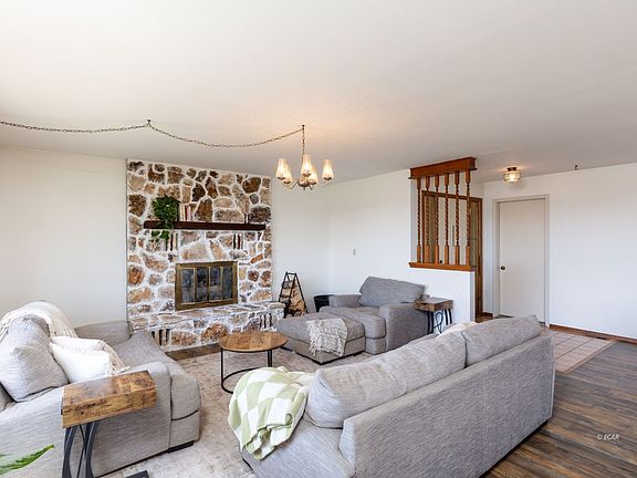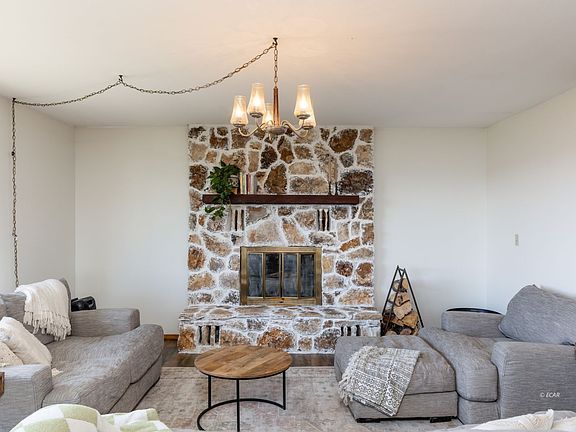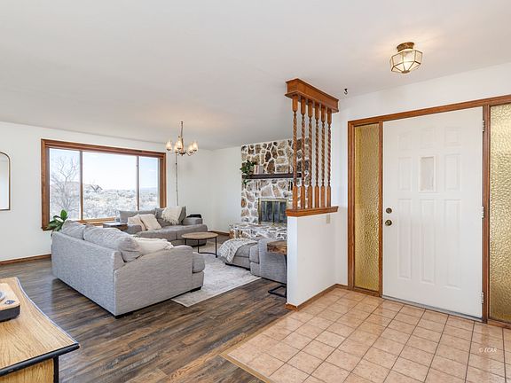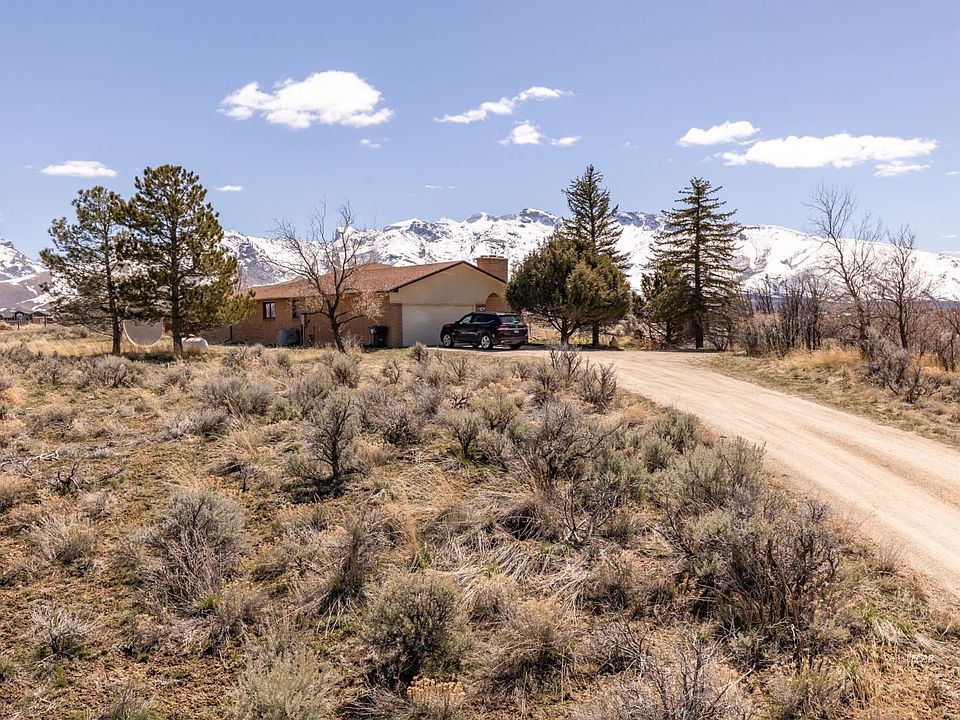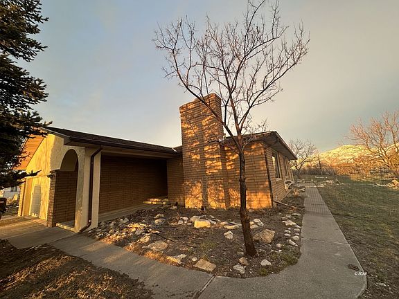 This one of a kind brick home is located perfectly on the high point of the lot with gorgeous views of the Rubies. The long driveway leads up to the 2 car garage and you'll also be greeted with several mature trees. The main entrance into the homes offers a front covered patio with stylish archway. As soon as you enter the home you'll appreciate the original aspects of the home which include all the wood accents/trim, glass light fixtures and stunning white washed rock fireplace. The main living area has vinyl plank throughout and tons of large windows to bring in the natural light. The living room is spacious and opens right up into the dinning room. The dinning room has French doors that open up to the covered back patio that has great views of the Rubies. The kitchen offers a breakfast bar, well taken care of tiled countertops and solid wood cabinets. Another perk of this home is the Master suite. The master suite offers an initial room that could be a nursery, den or even an at home office. Through that room is your large master bedroom with a private door to the backyard! There are two additional bedrooms, a guest bathroom and a large laundry room with great shelving.