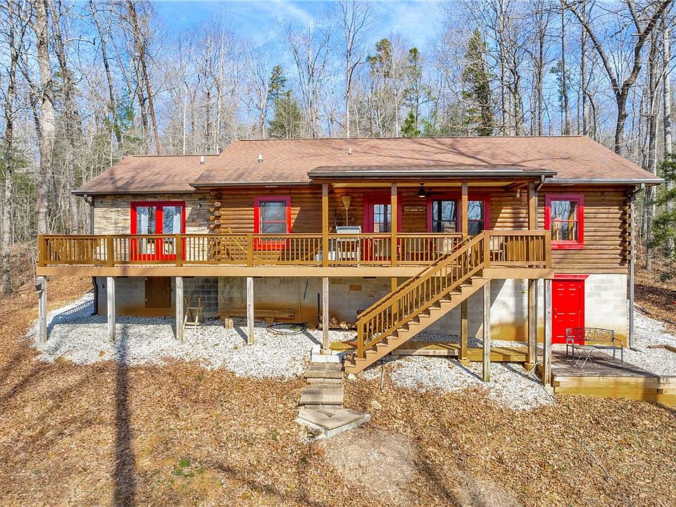 Perfect Getaway...This Log Cabin on Crystal Lake in Mountain Rest features 3 bedrooms and 3 full bathrooms. Comes fully furnished and ready to use or rent. Fiber internet is currently installed so you can be in the solitude of nature with the convivence of staying in touch or working from home. The open floor plan has ample natural light with large picture windows facing the lake. The kitchen has a stainless refrigerator, stainless dishwasher and gas top stove and oven. Hardwood floors and log walls compete the dining and living room area with a beautiful natural wood look. Once you exit the living area, you will find three bedrooms and three full bathrooms. The private master suite has an oversized garden tub and tile shower. The French doors walk out onto the full-length back porch which boasts views of the lake. Once outside the house, there is a mulched and maintained foot path that runs the length if the property. Down the path there is a flat fire pit area for cool fall days and at the end of the path, is your own private dock on Crystal Lake. The dock has been newly remolded for years of use. There is a boat house with power and water for evening grilling and includes a place to store your water toys. The lake is a beautiful, private, spring fed, clear mountain lake. Crystal Lake is perfect for swimming, fishing, kayaks, canoes, paddle boarding, and boats.