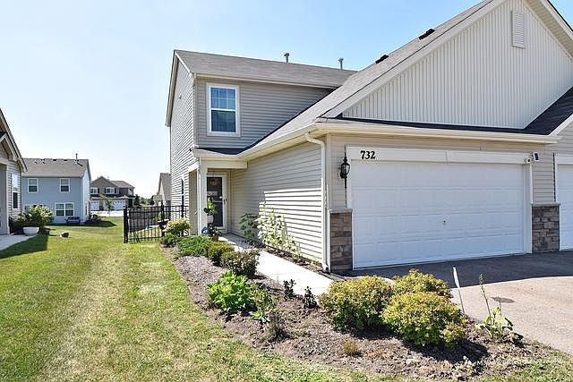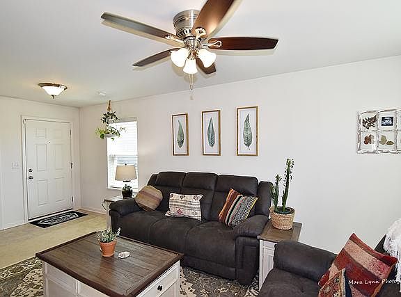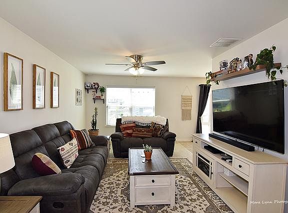 Wonderful floor plan on large fenced lot. Enjoy the evening and watch the sunset from your patio. Spacious great room with new carpet opens to the dining area with sliding glass door. Kitchen has 42" coffee colored cabinets and stainless steel appliances. Extra storage has been added to the 2 car garage with racks that stay. Laundry is conveniently located on the second floor. Large master bedroom with walk in closet and full bath. This 2 bedroom home has a great floor plan. Updates since purchased include: full fenced backyard, patio, humidifier, washer, dryer, refrigerator, window treatments, and storage racks in the garage.Beautifully done and ready for a new owner. Please note: this home is half a duplex. Owned fee simple with a master homeowners association. This is NOT a condo. Homeowner is including the wall mounted televisions.