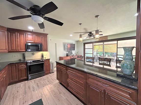 Beautifully Renovated home in the 55+ section of Lucerne Lakes. Move in with just your suitcase and your toothbrush or bring your own furniture. Either way you will enjoy the detail in this extraordinary renovation. It is the best of the best. From the mood lighting above the crown molding to the remote control of the lighting, fireplace and ceiling fans. The kitchen is complete with solid wood custom cabinetry including a built in office area, ample breakfast bar and food pantry finished off with crown molding. Granite countertops throughout with a deep sink and pull down sprayer. The upgraded appliances package includes fingerprint resistant black stainless steel, 4 door flex refrigerator and front control flat top range. Recessed & pendant lighting as well as ceiling fans. Doors and windows have modern wood architect panels giving a luxurious look vs traditional blinds. Tile flooring throughout including porcelain tile in living room and bedrooms and wood look tile in kitchen area. The Bathrooms were spared no detail including the shower design complete with tiled shower seats, glass accent, modern rain shower heads and custom shower doors. The ensuite master bath features dual rain shower heads on opposite walls and wand. Patio in the backyard is a tropical oasis with private BBQ and lounging. This property sits on a triangle lot more than a quarter acre with no one on the left side giving complete privacy in a park like setting. Double driveway leading to the single car garage big enough to generously fit 4 cars. Impact/hurricane rated garage door. Extra refrigerator in garage. Backyard is a tropical oasis surrounded by foliage on all sides. Large (200 sq ft) screened back porch leads out to patio (160 sq ft) for great barbecues. Sprinklers are on a well and house has city water. This pet friendly community allows 2 pets up to 40lbs each and offers a clubhouse with heated swimming pool and tennis courts. Come enjoy the Florida lifestyle in this beautiful home only 10 miles from the beach and surrounded by golf courses and public parks that offer water skiing lessons, bmx bike track, pickleball, tennis, bike paths, dog parks and more.