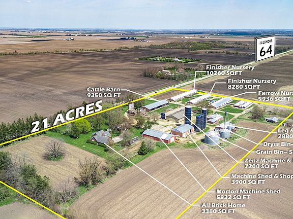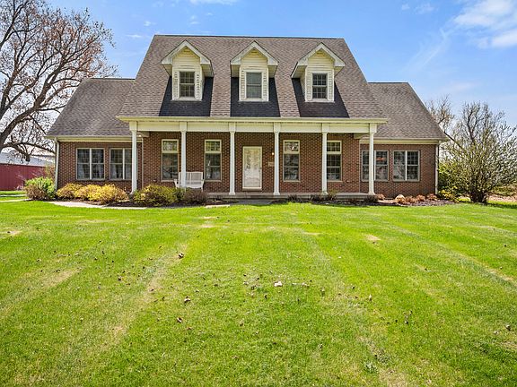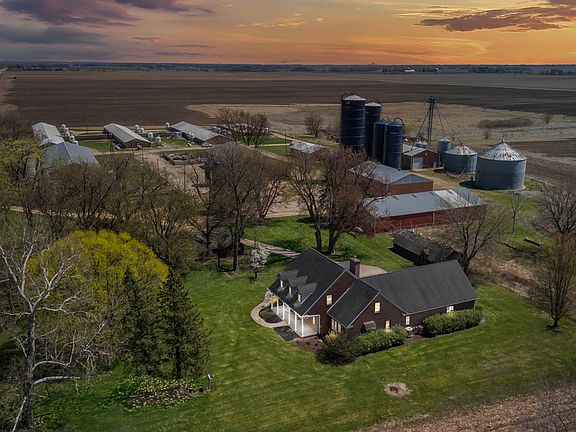 ***Click on Cinematic Property Tour!*** The Henke Property is improved with a GORGEOUS ALL-BRICK, TRUE CUSTOM HOME and EXTENSIVE OUTBUILDINGS. This high-quality home and building site is approximately 21.54 ACRES, zoned A-1, Agricultural District within Sycamore School District. The subject farm will accommodate a working, hobby, organic, or community farm and offers unlimited business opportunities and vast storage options. There are approximately 6.5 cropland acres. A property highlight is the 60'x120' Zenz-built Machine Shed with a concrete floor throughout. The present 1 1/2 story Cape Cod farmhouse was constructed in 2006. A covered front porch offers breathtaking panoramic views of the countryside! Ambiance abounds in the heart of this home, showcasing gleaming hardwood flooring, French and atrium doors, solid paneled doors, 9' ceilings, Pella double-hung windows with built-in blinds, and a neutral interior color scheme. The stunning custom kitchen presents 42" Amish oak cabinetry, revealing a "furniture look" and millwork with attention to detail. Granite countertops, tile backsplash, island and breakfast bar, Mission-style light pendants, and a complementary chandelier create an attractive appeal. You will love the built-in stainless steel GE Monogram double convection ovens! A KitchenAid dishwasher, GE Monogram refrigerator with French doors, pantry, and dining area with views of the front park-like setting, complete this chef's delight cooking space! A favorite gathering space is the Family Room featuring a floor-to-ceiling full masonry woodburning fireplace with stone mantle, gas logs and starter, crown molding in tiered ceiling, and double atrium doors to the outside patio. French doors, inlay hardwood floor detail, and transom windows are displayed in the Living and Dining Rooms. Built-in Amish custom desk arrangement completes the first-level office. First-level Primary Bedroom Suite hosts recessed lighting, stained glass ceiling-light fan, and a walk-in closet. In the beautiful spa-like bathroom, you feel a sense of tranquility and relaxation while soaking in the whirlpool tub or using the dual walk-in tile surround shower. There are two vanities and a skylight, too! Laundry suite offers electric dryer, washer, utility sink, closet, and convenient shower! Wait, there is more! The upper level includes a second primary bedroom suite with a private bathroom arrangement! Third and fourth bedrooms share a Jack-and-Jill bathroom. These bedrooms also have built-in storage chests for additional storage. A bonus is the basement, contributing a second kitchen/wet bar, carriage-style lighting, pantry with pull-out drawers, a built-in entertainment center, and a 3/4 bathroom. There is an in-floor heat system, four egress windows, two 75-gallon water heaters, a water softener, a filtration system to remove iron, an Aprilaire, copper plumbing, a battery backup to a sump pump, and a second air handler. This lower level has garage access, too! There are mature trees and professional landscaping that embrace this lovely one-owner home. Outbuildings include a Zenz-built machine shed with a concrete floor, a Morton-built machine shed, a machine shed and shop, a leg and feed building with recently installed dump pit, grain storage and grain drying bin, cattle barn, farrow nursery, and two finisher nurseries. Two northernmost hog buildings are under lease. Lease details are available upon request. There are two wells on this property. The larger well is located in the center of the yard and currently runs this farm. A new well pump was recently installed by H.I. Stone. The smaller well can also run the whole farm and is located by the little sidewalk off the driveway. 3+ car attached garage plus a 3-car detached garage. This is an estate sale, SOLD AS-IS. Some dilapidated buildings. After removing them, open up this farm and make it your own! "Sunrises & sunsets on the front porch await you!"