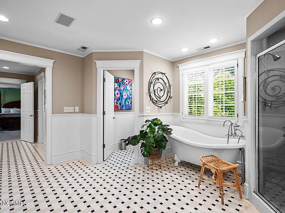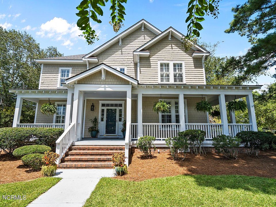 Stunning home in the premier neighborhood of Vantage Point at Covil Estates with 3,479 square-feet, 4 bedrooms, 3.5 bathrooms, formal dining room, den, office, and an impressive master suite. Situated nicely on a corner .43 acre lot, this beautiful home radiates sophistication and charm, starting with its beautiful wrap-around front porch. Deluxe finishes include 9-foot ceilings, hardwood floors, plantation shutters, and beadboard wainscoting. The light-filled great room features a gas fireplace with custom marble surround and built-ins. A stately kitchen highlights a 6-burner gas stove, granite countertops, under-cabinet lighting, GE Profile stainless steel appliances, a sizable island, built-in desk space, and double pantries. The large laundry room has a utility sink, built-in storage, and access to the side porch. Upstairs, you'll find a large open flex space in between the guest rooms. Two guest rooms share a Jack and Jill bathroom with dual vanities, marble counters, and linen closet, and the third guest room has an en suite bathroom. The impressive master suite boasts a large flex area, perfect for a lounge or home gym, an oversized bathroom with a wet bar, refrigerator, clawfoot tub, tile shower, dual vanities, and three spacious walk-in closets. This is a dreamy master suite you'll never want to leave! The covered veranda overlooks your fenced-in backyard with mature landscaping. Additional home highlights include a two-car garage, whole house audio, new carpet 2021, new water heater 2019, new roof in 2021, and an encapsulated crawl space and dehumidifier. Vantage Point is located just outside the city limits (no city taxes) featuring a pool, clubhouse, pickleball and tennis courts, basketball, and playground. Endless shopping, dining, lifestyle, and entertainment options are within 2 miles of this home and only 4.3 miles to Wrightsville Beach. Excellent opportunity to own an exquisite home in a prime location – call today to make it yours!