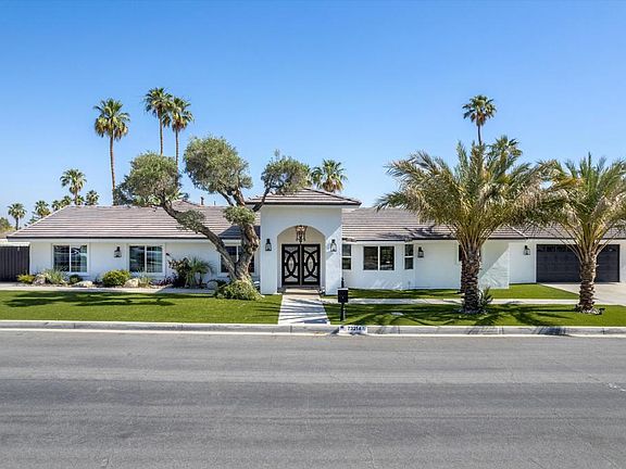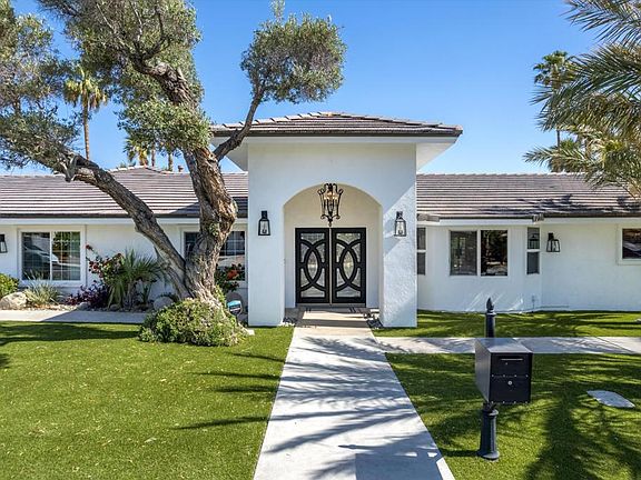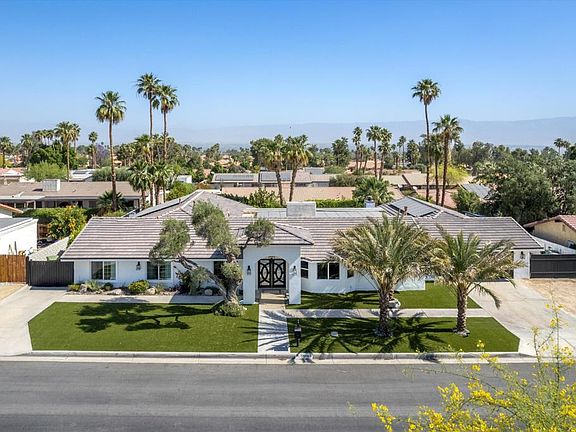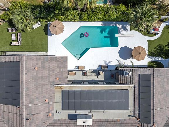 EXQUISITE South Palm Desert 4 bed, 4 bath 4342 sq ft home w/ solar system, dreamy entertaining backyard and views of the western mountains! This stunning home will wow from the moment you enter w/ an open floor plan that welcomes you to a living room area w/ stone accent fireplace and a GOREGOUS gourmet kitchen. Massive single slab granite kitchen island w/ farm sink, granite counters w/ custom finished cabinets, industrial gas range, a second main farm sink, high end stainless steel appliances, a full walk-in pantry w/sink behind a solid wood custom door, vaulted ceilings, intricate light fixtures and accents. Follow the flow into an oversized family room area complete w/ another stone accent fireplace & half bath. The impressive dining area features huge dining table, granite top dry bar area w/ dual beverage units and incredible array of 9' custom metal French doors w/ natural lighting guiding you outside. The back yard is an entertaining delight w/ oversized pool complete w/diving board, putting area, stone accents on back of home, multiple seating areas, faux grass and custom outdoor fireplace. The primary bedroom is a must see that features his and hers walk in closets & primary bath that has large full tile walk in shower, dual vanity, separate tub & access to back patio. Don't miss the 2rd bedroom! Vaulted ceilings, full walk in closet & wonderful space to make this room special. A home that has all the pride in ownership & attention to detail.