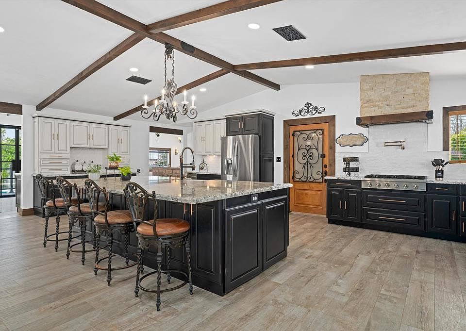 • Beamed Ceilings, Breakfast Bar, Built-in Features, Cathedral Ceiling(s), Dry Bar, Separate/Formal Dining Room, High Ceilings, Open Floorplan, Recessed Lighting, Bar, Bedroom on Main Level, Dressing Area, Main Level Primary, Primary Suite, Walk-In Pantry, Walk-In Closet(s)