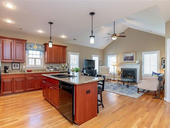 Price reduced! Gorgeous, one level home where the living is easy! BEST PRICE in this maintenance free, 55+ community! You'll love the OPEN KITCHEN with upgraded CHERRY CABINETS, GRANITE counters, porcelain sink, recessed and pendant lights, and L-shaped ISLAND with seating. Grab a beverage from the built in WINE COOLER and relax in front of the fireplace in the GREAT ROOM with cathedral ceiling. Upgraded wide plank hardwood floors in all common areas. Enjoy dinner with friends in the FORMAL DINING ROOM or out on the PATIO surrounded by a privacy fence. Huge MASTER SUITE with 17 ft bedroom, and 15 ft tile bath including WALK IN SHOWER and CLOSET. The GUEST BEDROOM SUITE has an attached tiled full bath with tub and shower. Large laundry area with FULL SIZE stack washer and dryer. CENTRAL VACUUM cleaner too. Plantation shutters throughout. ALL APPLIANCES included. Large attic is partially floored. CLEAN 2 CAR GARAGE. Everything is tip top shape in this home located at end of cul de sac driveway, which backs up to a wooded buffer for more privacy. Community CLUBHOUSE includes exercise room, library, kitchen, and indoor and outdoor spaces for community and private gatherings. #55andover