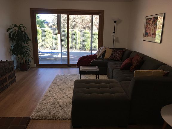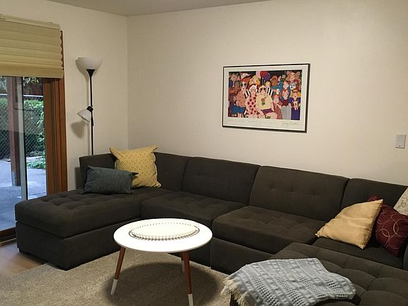 Fully Furnished + Newly remodeled ! New wood like vinyl plank flooring throughout, new paint and kitchen sink + counters. Spacious, bright day light basement with large patio, near city park. Two sleeping rooms: 1 Queen bed and 1 twin bed. This is a Mid Century Modern House with 2 separate living units. The rental unit is 1150 sq. ft. day-lite basement. It has 2 separate entrances: a "man door" and an 8' sliding glass door; both open onto a large patio with a fenced yard. Back gate opens onto a quiet, 12 sq. block tree lined city park with soccer field, baseball diamond and play equipment. 2 parking spaces available. Motion sensor lights surround the house. Inside this newly decorated unit is luxury vinyl plank wood like flooring throughout, freshly painted walls and new pleated shades. A free standing natural gas stove in living room for ambiance and coziness, in addition to full house natural gas heating and air conditioned systems. Large bathroom with shower and bathtub for relaxing after a hard day. Towels are provided. Kitchen is furnished with Keurig coffee maker, dishwasher, dishes + glassware, cooking utensils, microwave, smooth top stove and convection oven. Plenty of storage. Shared outdoor BBQ is available. 2 sleeping areas. One room has Queen bed, dresser, bench, night stands. The other bedroom has a twin bed w 1 yr. old memory foam mattress, a dresser, night stand and bookcase. Sheets, blankets and comforter provided. WiFi reception is good here, along with basic cable with Xfinity streaming options and basic Roku. Proof of Covid 19 vaccinations is required. Owner lives in upper unit and is easily accessible to answer questions or help resolve problems. Owner has one non-allergenic dog who is rarely in back yard. We are located close to 6 hospitals, 4 colleges, about 1/2 mile from Interstate 5 and about 6 miles from Hwy 26. There are 3 different bus lines nearby. We also have 2 major grocery stores/pharmacies within 6 blocks and a lovely little village with coffee shops, bars and restaurants and bookstore called Multnomah Village about 10 blocks away. Many neighbors walk thru the park daily. It is a friendly and "safe" neighborhood. Walk score = 70, Transit score = 44, Bike score = 70, Personal Crime score = Less than average, Property Crime = Less than average. No pets please. Rental Term: 2 month term preferred. Execution deposit (similar to earnest money) of $1100.00 is applied to first month's rent upon move in. If cancel within 14 days of move-in date, execution deposit will be forfeited. Security deposit is $2100.00 and is refundable if apt is clean + no damage when move-out. Rental Application Criteria: Landlord's Choice. Please email me to schedule time for a phone call. Thanks for your interest. 30 day min. rental, however rental term must end by July 31, 2022. Execution deposit of $1100.00 due upon rental application approval. This $1100.00 applied to First mo. rent upon move in. Security Deposit $2100.00, Proof of Covid vaccination required. No Smoking. Quiet hours are 10:00 PM to 7:00 AM. Utilities are per person: Central A /C and Natural gas, plus natural gas free standing stove in apt. living area, electricity, basic cable on ROKU TV. Internet WiFi, garbage + water. Parking: 2 parking spaces available. NO PETS.