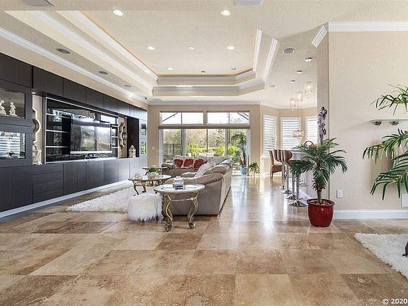 Walk up the pavered walk way to the double door entry that leads to a welcoming foyer that boasts a beautiful chandelier, high ceilings and travertine flooring in main areas. The great room area features a specialty tiered ceiling and a one of a kind floating wall entertainment center which opens to the kitchen which features open eating counter, granite counter tops, 42' cabinets, Stainless steel appliances, 5 burner gas range with 2 ovens, pantry, cozy breakfast nook overlooking lush landscaped yard, formal dining area for special dinners, flex area off main living area with fireplace, 3 way split plan for maximum privacy with baths conveniently located, all bedrooms with bamboo flooring, owners suite features tray ceiling, 2 custom walk in closets, luxury bath with garden tub, walk in shower and split vanities. Great room features double sliding doors to a spacious newly screened lanai with special lighting making it a perfect extension of outdoor living space for entertaining. Additional features plantation shutters, floored attic, water softener, security cameras, outdoor lighting highlights the meticulously landscaped yard. Enjoy the community pool and convenience to shopping, restaurants, schools and UF.