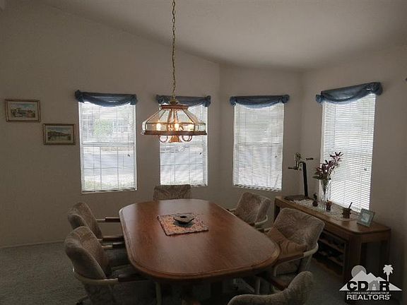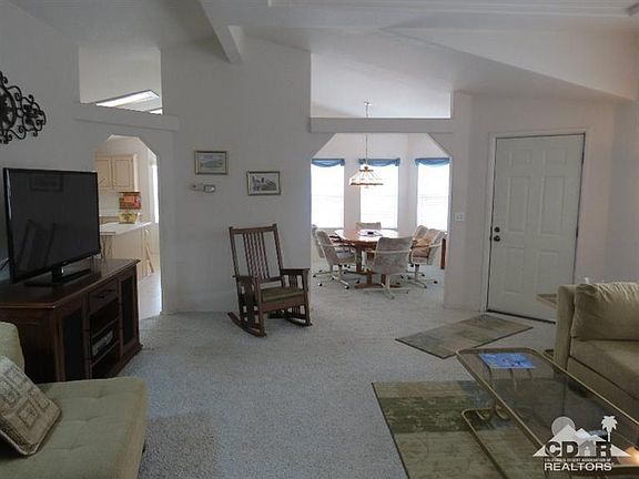 Check out this 1997 Silvercrest with garage that has a unique floor plan and offers three bedrooms and two full baths. The sellers had the home designed with an open living room and formal dining area off the expansive kitchen. A den or third bedroom with double doors is the perfect place for a home office or hobby space. The master bedroom is located at the back of the home and has access to a beautiful patio area for enjoying our great desert weather. The guest bedroom and bath are perfect for out of town guests. Situated on a larger lot on an internal street, this location is not too far from the main clubhouse. The furniture and golf cart are negotiable and this home is already on a permanent foundation for ease of financing. Take a tour today!