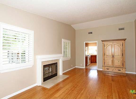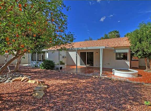 This is a lovely home with great curb appeal and is move in condition, immaculately well-maintained and offers a security system and a security screen door. The home is on a large corner lot with multiple fruit trees and is walking distance to College of the Desert, McCallum theatre, the driving range, the mall and more. The home is freshly painted, has new plantation shutters, bamboo floors and a gas fireplace along with high ceilings in the living room. The kitchen offers new cabinetry and a gas stove as well as a sit down bar and a formal dining area with sliders to the back patio where you can enjoy southwestern mountain views. The master bedroom has bamboo flooring and a large walk in closet. There is an attached enclosed sunroom off the master. All three bedrooms have lighted ceiling fans. Enjoy tile flooring in traffic areas and carpet in the two additional bedrooms. Separate Laundry room inside. Two car garage with built in shelving. And a built in barbecue.