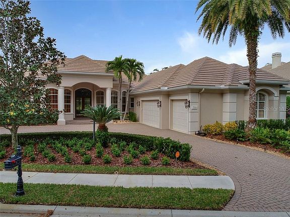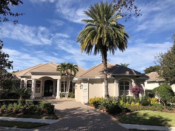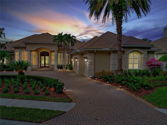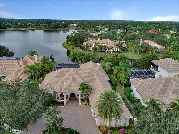 Tranquil elegance describes this spectacular move in ready executive home in the exclusive Chelsea section of University Park Country Club. Stunning views await the new home owner as this home sits on one of the nicest lots in the community, with long water views and golf course views stretching beyond the water from the pool and the incredible outdoor living area. Beautiful views of the golf course also await you as you enter from the front of the home. This custom home was built by Najjar Construction and every architectural detail and custom feature was carefully planned. The double wood door front entry opens to soaring double tray ceilings, crown molding and built-ins and attention to detail that won't disappoint. The large kitchen features beautiful wood custom cabinets with granite counters and an island for additional space while entertaining. Upgraded appliances include a built in oven convection/microwave combination, dishwasher, and large double door refrigerator with wood panels. There's also a large hidden cabinet walk in pantry for additional storage! The kitchen overlooks the amazing views of the pool and outdoor living area. Spectacular views continue into the family room, and on a cool winter evening you can even turn on the beautiful gas fireplace to add to the ambiance. The dedicated office has beautiful built-ins and plenty of space. The large light and bright bonus room has panoramic water views and features exceptional tray ceilings and custom features. The owner's suite features wood floors and floor to ceiling windows with plantation shutters, a stunning tray ceiling with custom ceiling detail, and an exceptional large walk in closet. The owner's bath has a large his and hers walk in shower, jetted garden tub and duel sinks with a large vanity and makeup area with abundant of cabinets. The outdoor living area has amazing views and two large covered lanai areas that over look the large tropical pool and spa. The Country Club boasts 27-hole championship course and practice facility designed by renowned golf course architect Ron Garl and is ranked as one of the top courses in Florida. The Tennis facility has eleven lighted har-tru courts. The fitness center has an array of exercise equipment and cardiovascular machines, and a work out area for fitness classes. The Park Grille & Café is open seven days a week and features dramatic lakeside dining and views. The only requirement for new owners is a social membership. This home has a brand new tile roof, new exterior paint and extensive new professional landscaping and lighting were just completed. This gem is ready for immediate occupancy and is in perfect move in condition.