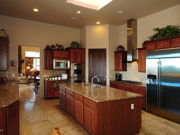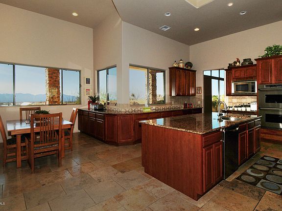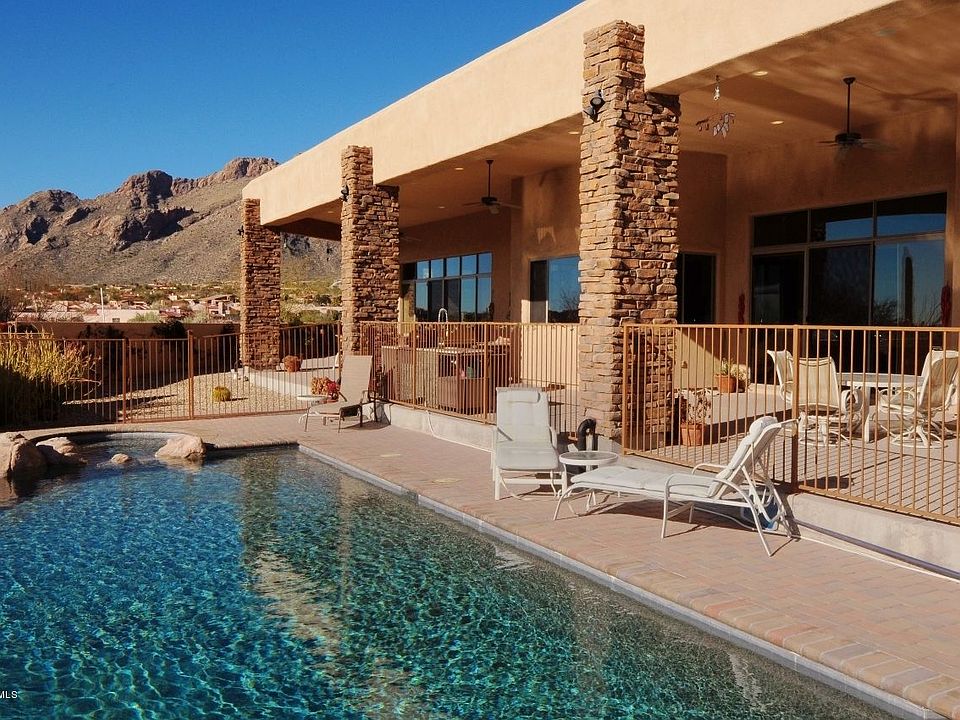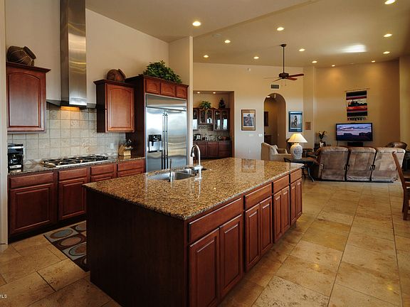 Hilltop home built by Chastain Builders with expansive mountain and city views. This home has 14' ceilings, great room with travertine tile throughout the house. 8' Knotty alder doors, cherry cabinets in Kitchen with Dacor stainless appliances, gas range, double oven, warmer and side by side refrigerator. Wine pantry, and wet bar in great room. Master suite with large walk in closet, jacuzzi and walk in shower,his and her lavatories. There are two more bedrooms and an office. Each room is ensuite. There is a separate guest house with mini kitchen. Grounds have lemon, grapefruit, pomegranate and orange trees. Negative edge swimming pool overlooks the city and A Mountain. Owner /Agent