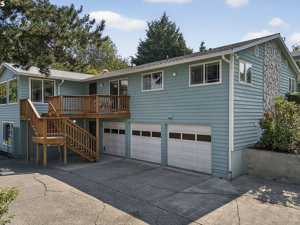 Set on a quiet no-outlet street, this spacious Raised Ranch overlooks Mt. St. Helens and the snow-capped Cascade Range. Its versatile floor plan includes four bedrooms, three full baths, two kitchens, two fireplaces, and dual laundry hook-ups. The elevated main level is paired with a recently remodeled daylight basement complete with a full kitchen, giving the home remarkable flexibility. It is well suited to multi-generational living, guest quarters, house hacking, a home office, a preschool, or a dedicated entertainment space. Recent updates on the main floor include new Corian countertops in the kitchen and baths, a Corian hearth, fresh interior paint, and new carpet throughout. The daylight basement has been remodeled from top to bottom, creating a fresh, adaptable lower level with modern finishes. A 900-square-foot, three-bay garage (not included in the home’s listed square footage) provides abundant storage and versatile workspace. With its size and layout, it is ideal for the hobbyist, car enthusiast, woodworker, or anyone in need of a dedicated project area.The private yard features a patio, raised garden beds, raspberry bushes, blueberry shrubs, and a plum tree, offering space for gatherings, play, or quiet retreat. Beyond the yard, the lot extends into a neighborhood common area with a seasonal spring and apple trees, adding a rare natural amenity.This Raised Ranch retreat blends architectural appeal with thoughtful updates, offering true move-in-ready comfort. Located just minutes from the heart of the Lents neighborhood, enjoy local favorites like Bella’s Italian Bakery, the Portland Pickles baseball stadium, the Lents International Farmers Market, and more. [Home Energy Score = 1. HES Report at https://rpt.greenbuildingregistry.com/hes/OR10241550]