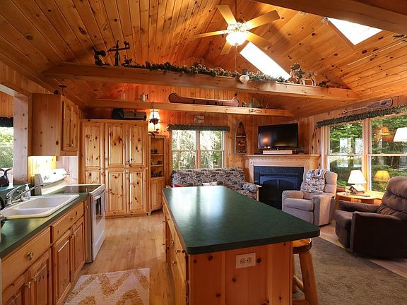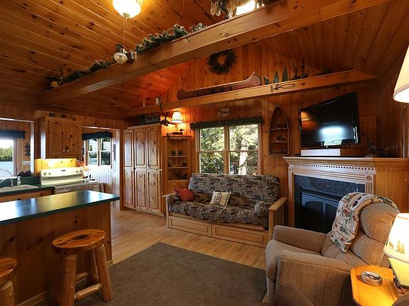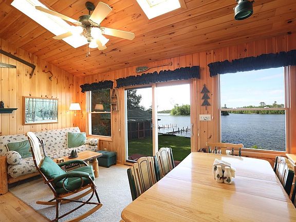 Furnished Waterfront Retreat At Water’s Edge, Right Out of “Cabin Life”! Panoramic island studded views, extensive recent updates, 140 ft excellent swimming shoreline, set back off paved Hwy 115 on prime Frazer Bay, close to town, golf, dining. 772 SF 3BR/1BTH cabin. Boathouse w/rail system, sauna room, screen porch. Garage w/extra frig. 2 Docks. Vaulted kitchen/dining/livingroom with fireplace & glass doors to deck on waters edge offering sounds of water lapping shore, loon calls & lake breezes. Two main flr BRs, one lakeside. Main flr BA. Spacious sleeping loft. Just bring your clothes & groceries & kick back & relax! Click link for 3D Tour!
