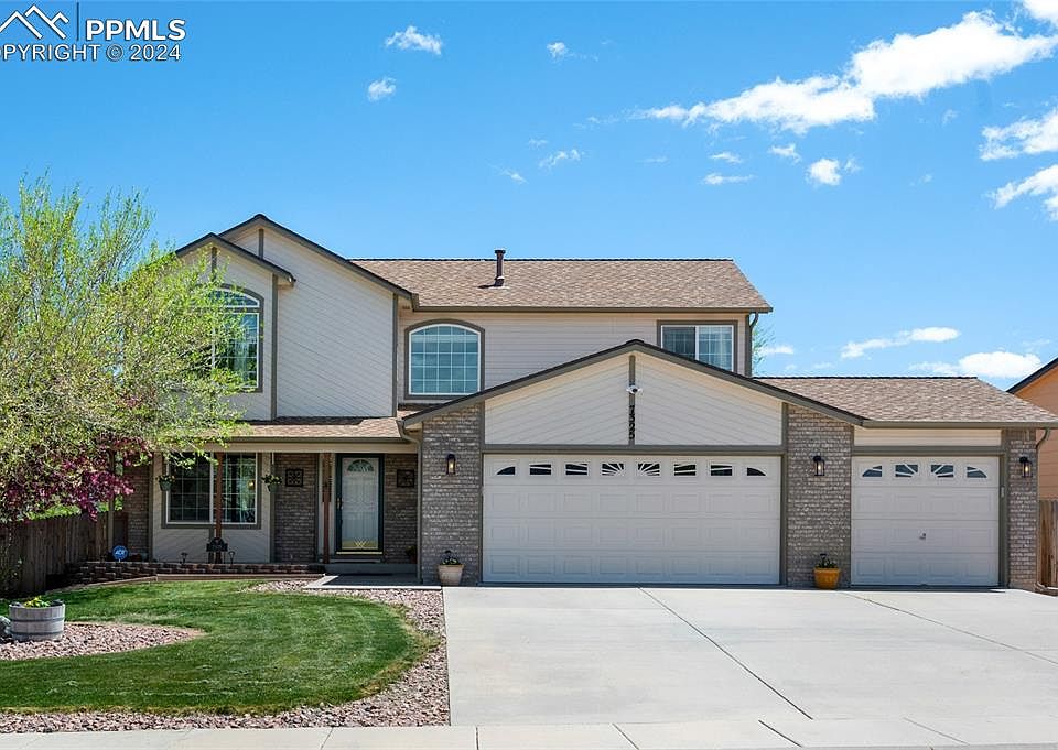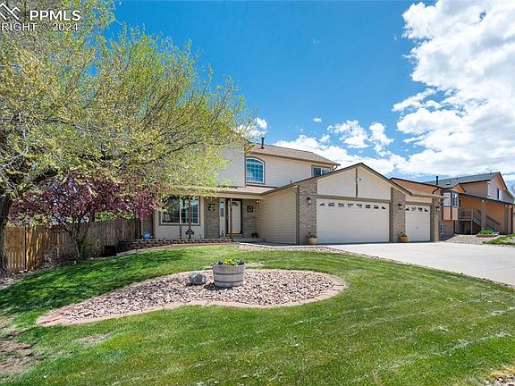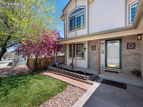 Welcome home to this beautiful gem located in the peaceful community of The Glen At Widefield. A classic front porch provides an inviting welcome. As you enter, the formal living and dining rooms greet you with their timeless charm, while abundant natural light dances throughout the space, highlighting the luxurious vinyl plank flooring that graces the main level. Prepare to be wowed by the recently remodeled chef-worthy kitchen, boasting top-of-the-line amenities including a dual-fuel stove, custom granite countertops, a custom eat-in island, under-cabinet lighting, custom backsplash, built-in desk, and a sliding door leading to the backyard featuring a new composite deck with wrought-iron railings. Cozy up in the inviting family room complete with a fireplace, perfect for relaxing evenings or entertaining guests. Upstairs, three generously sized bedrooms await, including the primary suite featuring a lavish 5-piece bath with custom tile shower/bath and underfloor heating, offering respite from the cold Colorado winters. Custom granite and tile work adorn all bathrooms, adding a touch of elegance. Both the primary and the front guest bedrooms have views of Pikes Peak. The large unfinished basement offers endless possibilities, whether you envision a home gym, office, or additional living space. Step outside into the private backyard, ready to bloom with the arrival of spring. A storage shed complements the home nicely, providing ample space for outdoor equipment and tools. Conveniently located just 15 minutes from Peterson, Carson, or Schriever, and a mere 10 minutes from COS airport, yet nestled in a peaceful neighborhood, this home offers the perfect balance of convenience and tranquility.