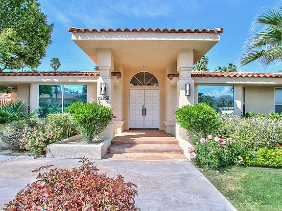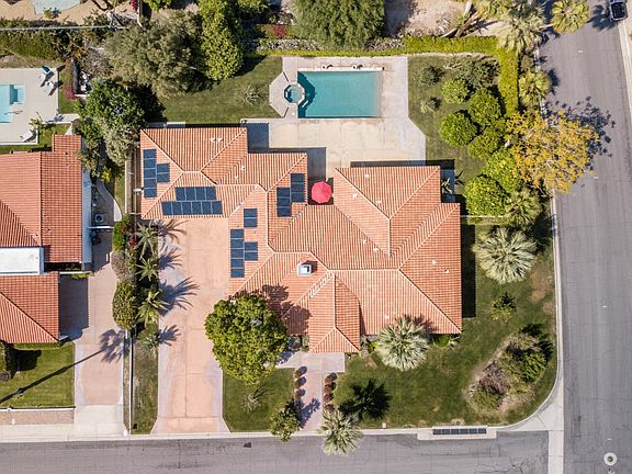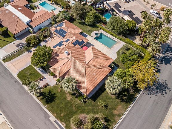 Elegant Mediterranean Inspired Pool Home In South Palm Desert On Large Lot. With 3,982 sq ft of interior living, this spacious solar powered estate home has 4 bedrooms & 4.5 bathrooms. Entrance leads to formal living room with gorgeous cast iron fireplace & formal dining room. This is a true Chef's kitchen featuring a Thermador 6 burner range, 48in built in Sub Zero refrigerator, 3 dishwashers, Butler pantry, granite slab counters, mahogany cabinetry with ample storage & a breakfast room. Family room is off the kitchen & opens to the lushly landscaped yard. Master suite is very spacious featuring a large walk in closet plus it's own bathroom with upgraded rain shower & tub with jets. plus toilet & bidet. All three guest bedrooms are spacious & two have private bathrooms. The tropical setting of the backyard features a large sparkling pool & spa with gorgeous mountain views, lots of outdoor entertaining space & a big grass area with many fruit trees. This is on a 19,000 sq ft corner lot with long RV sized driveway plus oversized 3 car garage. Home has very low energy costs due to the Solar. Call me today for an appointment to see this incredible South Palm Desert home!