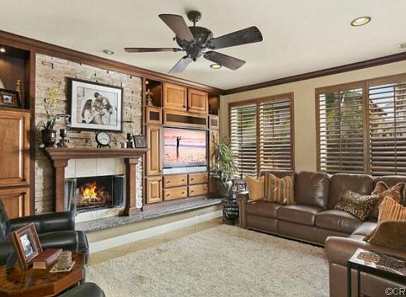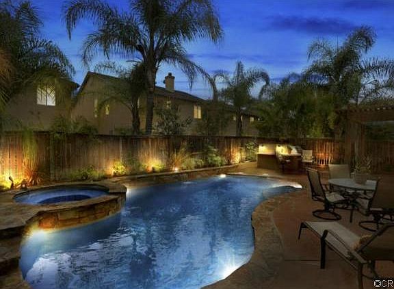 This exquisite Serrano Heights home has been highly upgraded & designed for entertainment. The kitchen features maple cabinets & granite counter, a center island with breakfast bar, gas cook top, double ovens, a walk in pantry & breakfast nook. The Kitchen opens to the family room featuring a fireplace with custom walnut wood mantle, ledger stone hearth & entertainment center. The formal dining room & living room have been modified to the perfect game room. These rooms have been tastefully enclosed with custom 8' solid core arched colonial doors accented with crown molding & 5" baseboards with designer ceramic floors with a wood There is a main floor bedroom & full bath. The master suite is beautifully upgraded with crown molding & dark wood shutters. The bath has a custom travertine shower with bench, travertine counters & floors & upgraded lighting & mirrors. The 3 additional bedrooms have walk-in closets and two have ceiling fans and recessed lighting. The hall bath has travertine counters and under mount sinks. The salt water pool & spa and built in high end Viking BBQ are the finishing touches to the outdoor entertainment area!