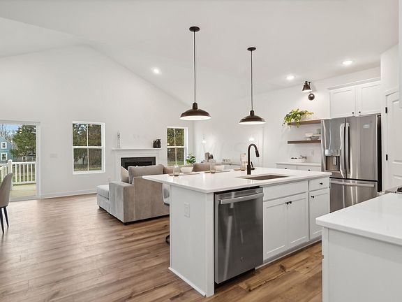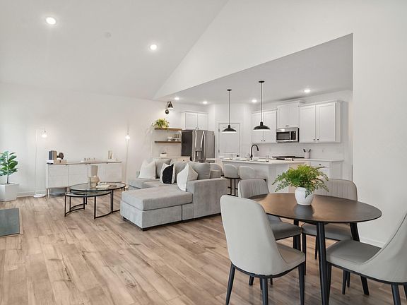 Stylized in our designer curated Farmhouse Look. Beautiful Elkins white cabinets & Aristokraft floating shelves. Spacious Cararra Miksa quartz countertops & pendant lighting. Gorgeous great room with luxury vinyl flooring. Stunning dining area featuring high vaulted ceilings. Luxurious primary suite with generous walk-in closet. Spa-like primary bath with matte black finishes. Additional covered patio for relaxing outdoors.